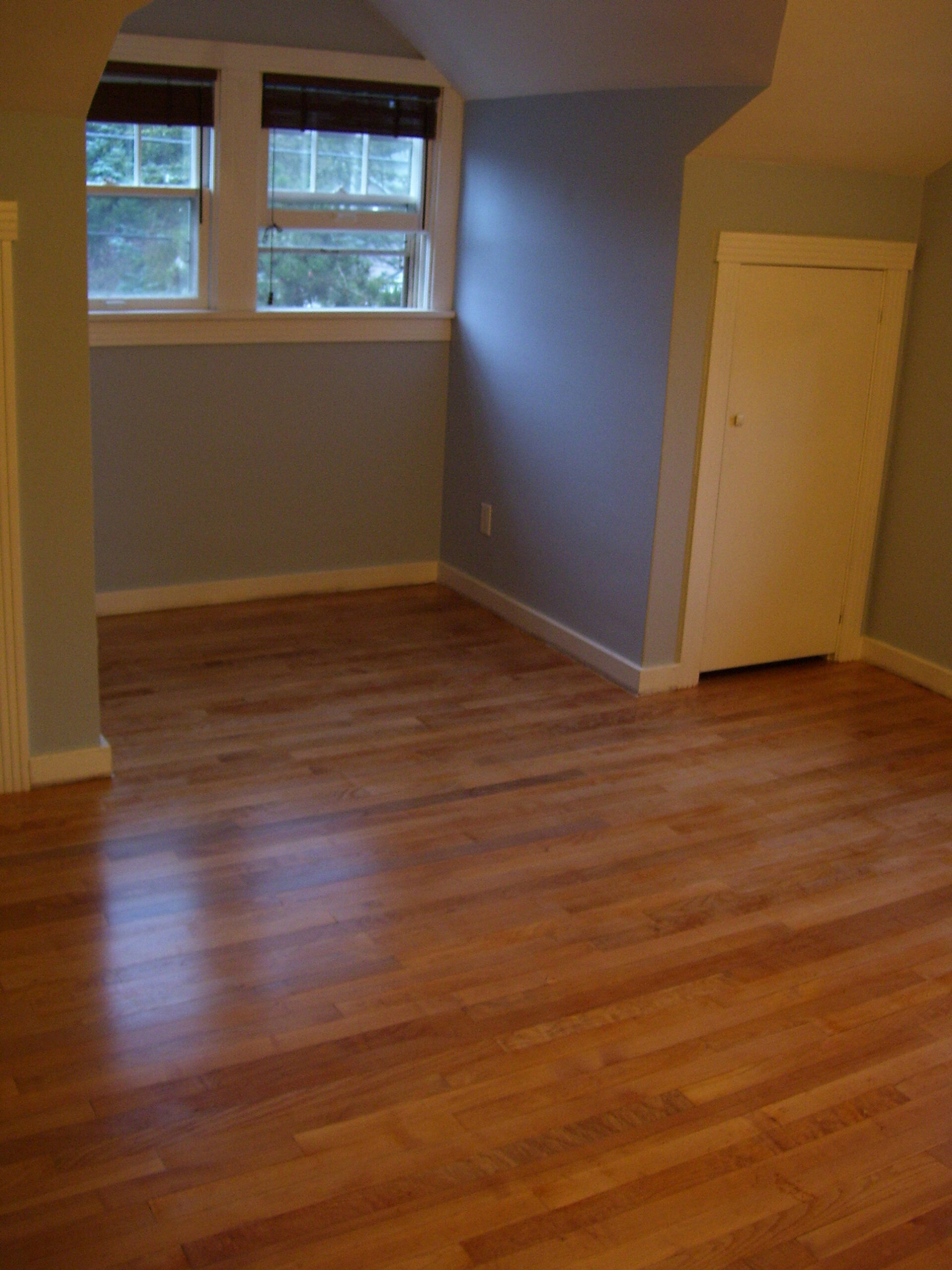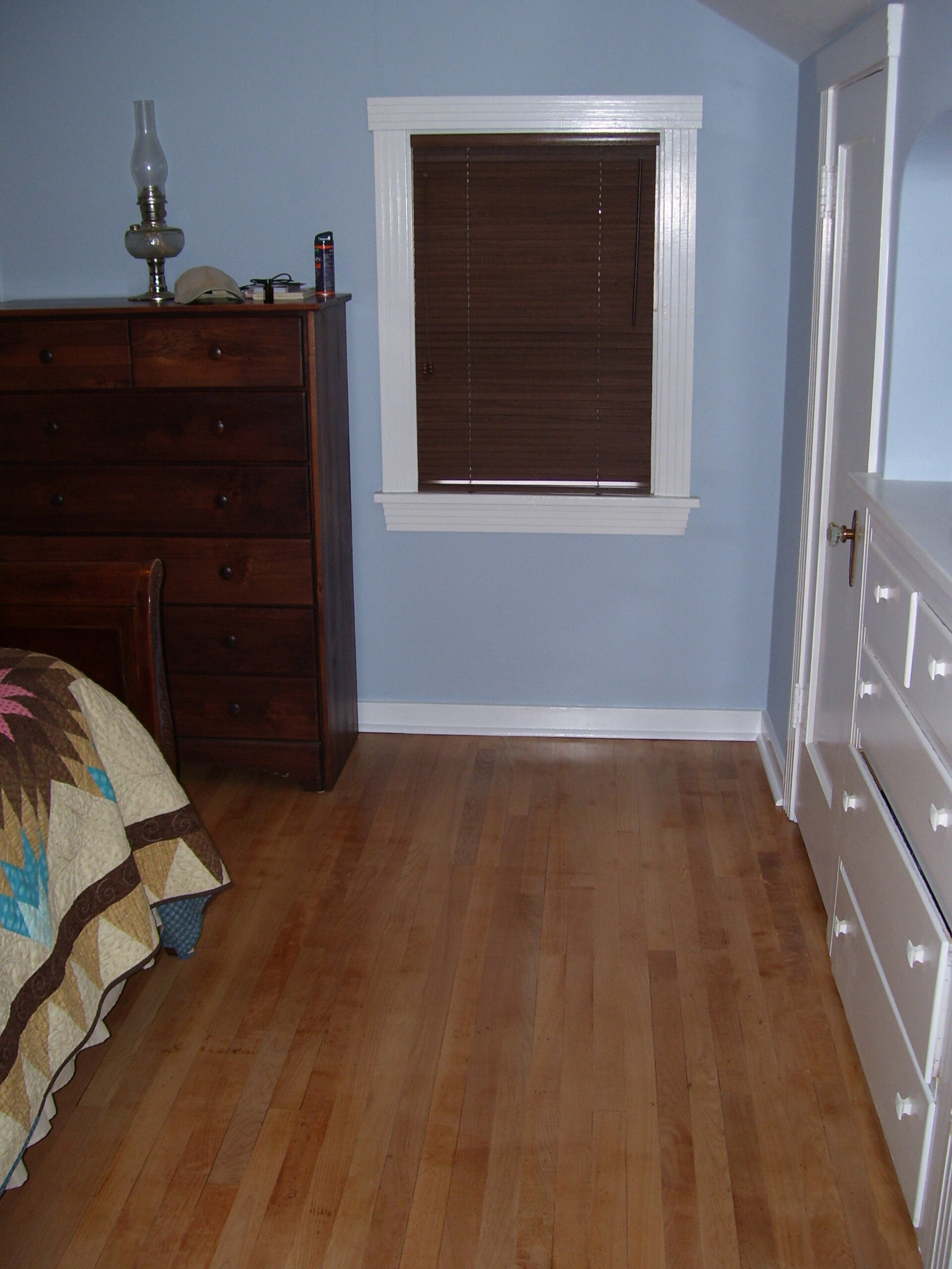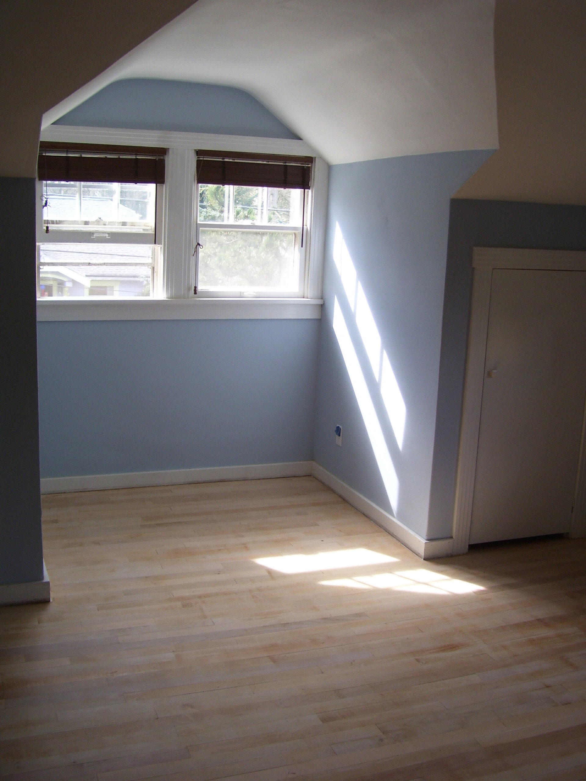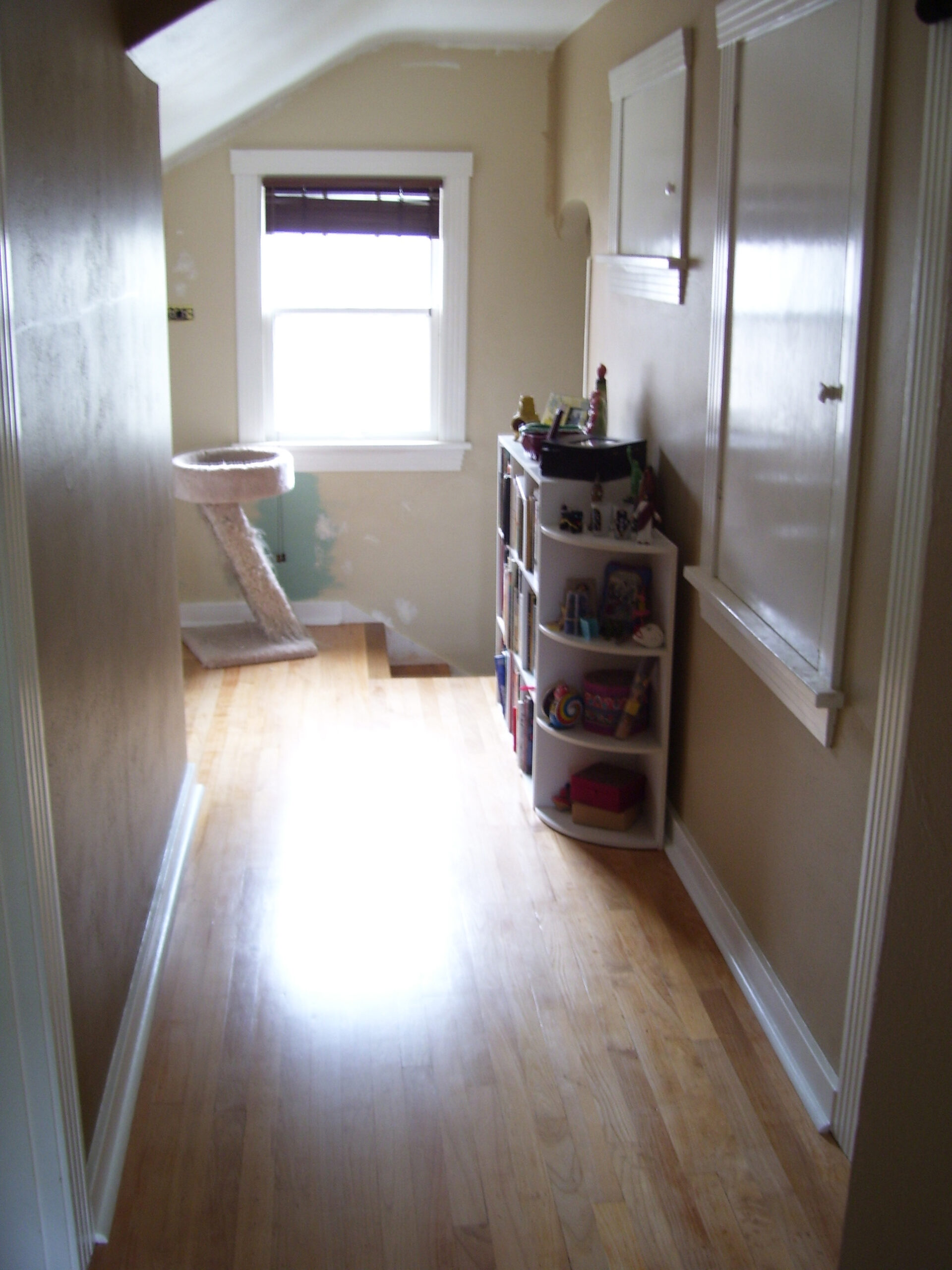 When we moved into the house there was beige shag carpet on the stairs and the top floor. We checked under the carpet when we looked at the house and saw the wood floors. We knew removing the carpet and finishing the floors would be one of our first projects. It looks so great and we discovered a laundry shoot outside the bathroom door!