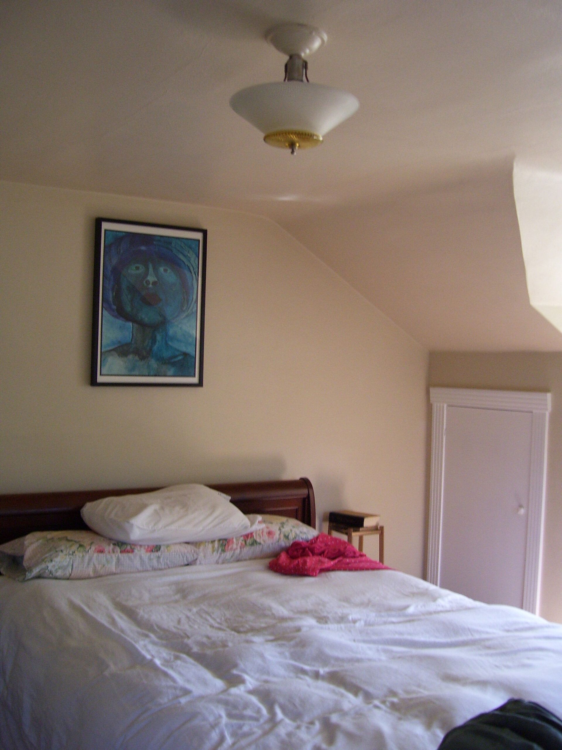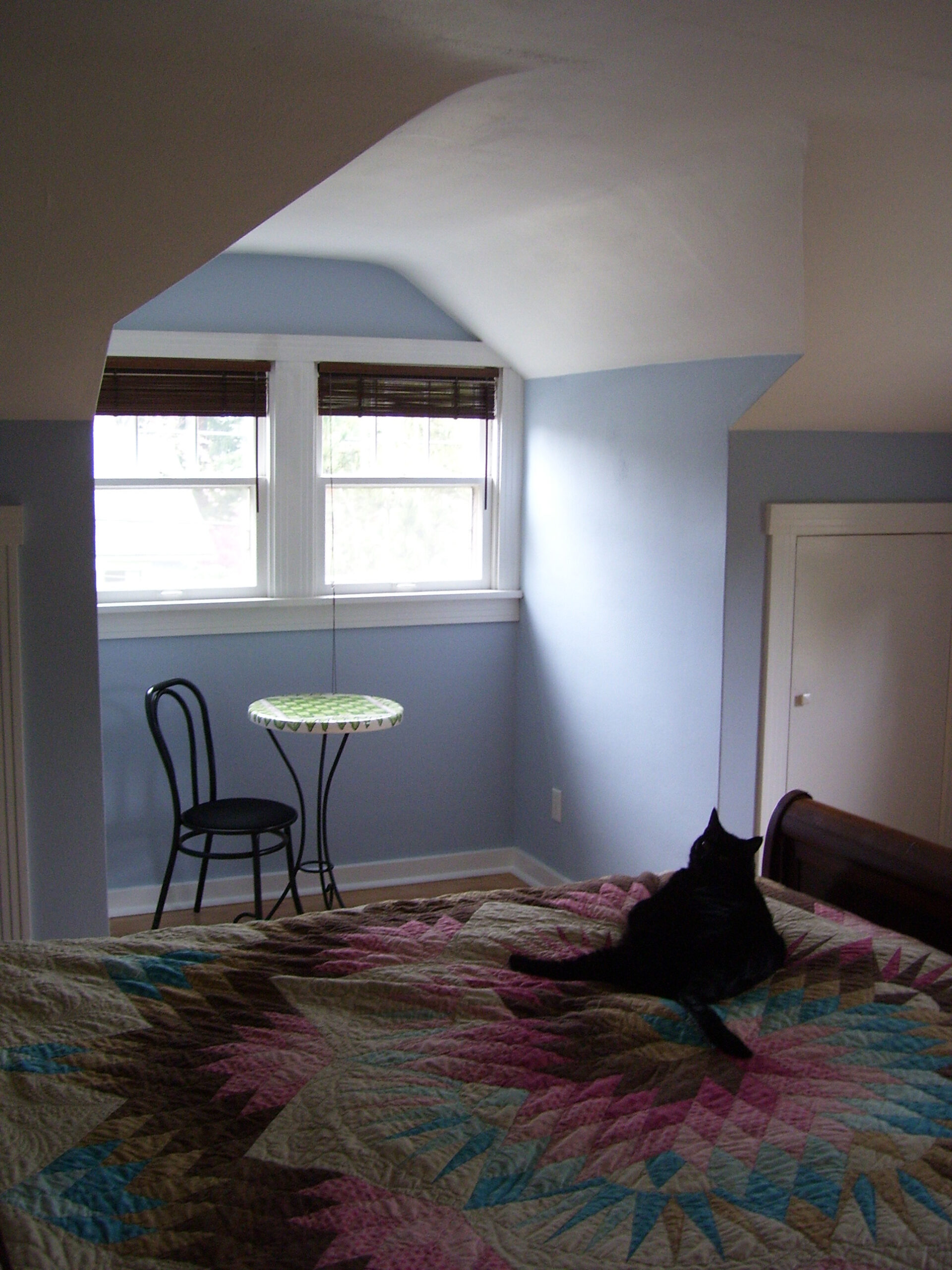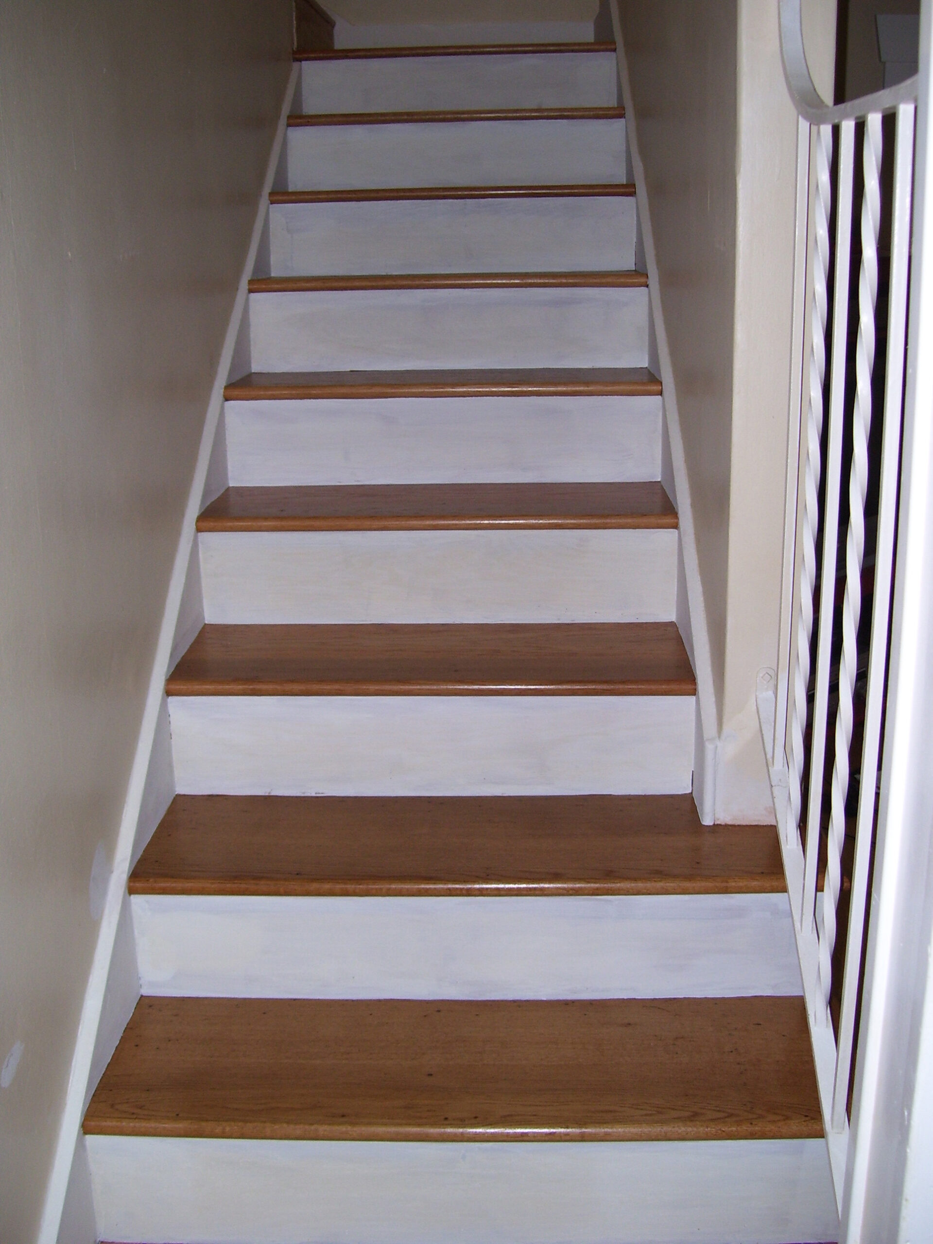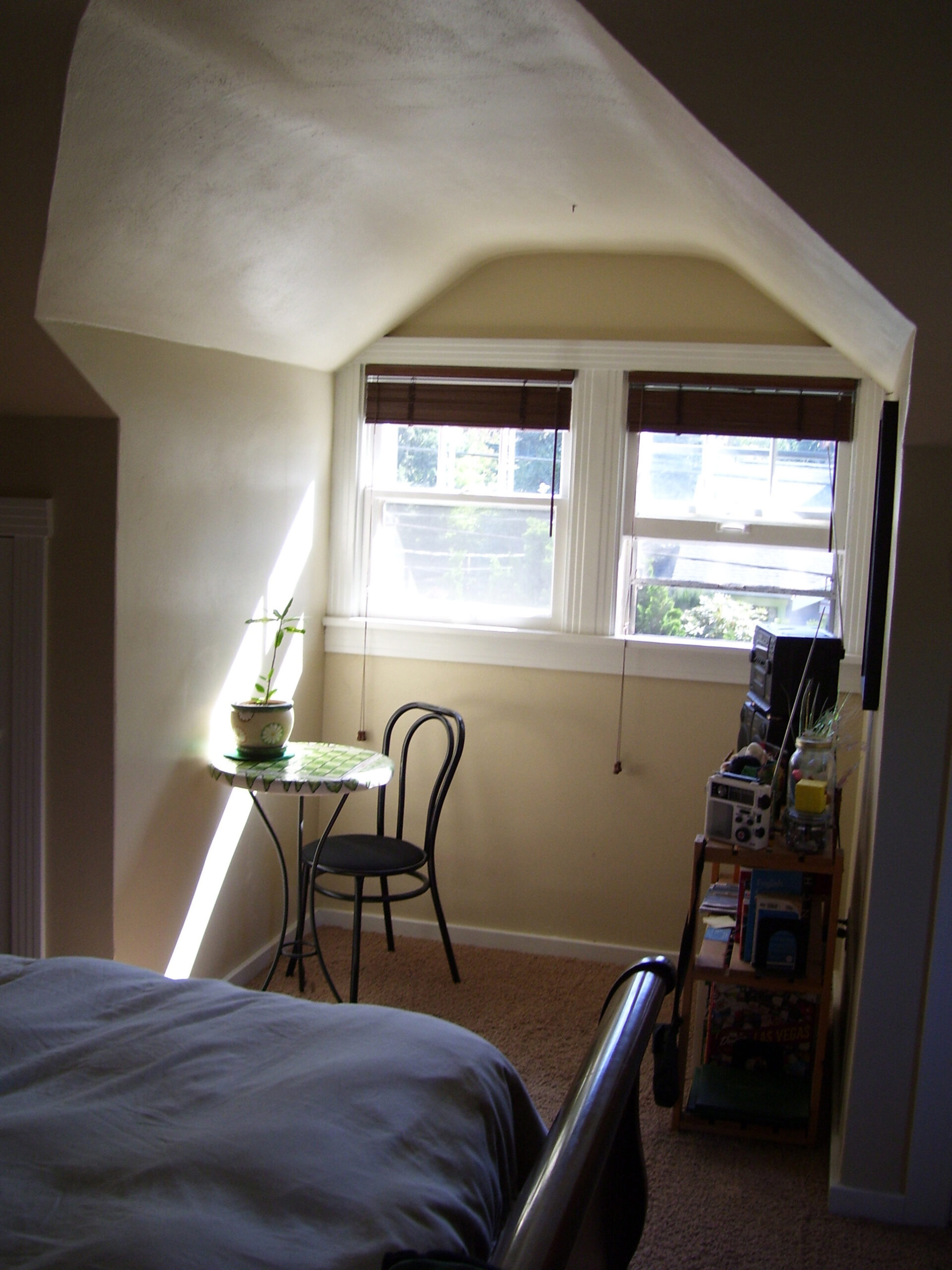 When we moved into the house there was beige shag carpet on the stairs and the top floor. We checked under the carpet when we looked at the house and saw the wood floors. We knew removing the carpet and finishing the floors would be one of our first projects. It looks so great and we discovered a laundry shoot outside the bathroom door!