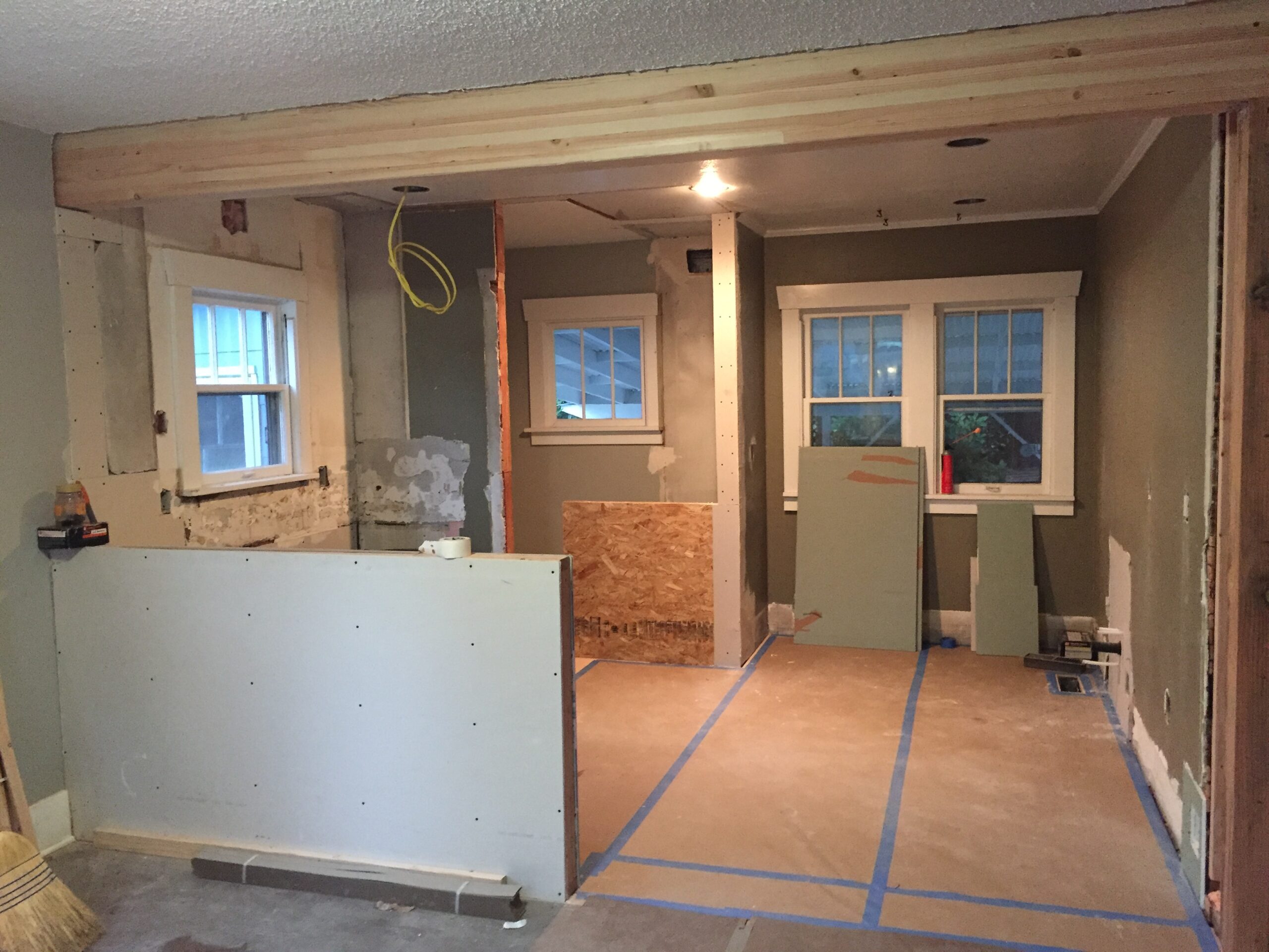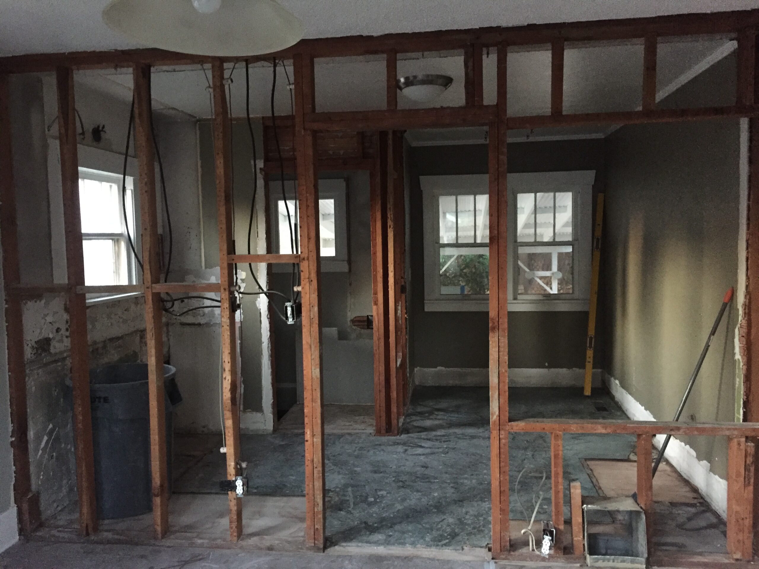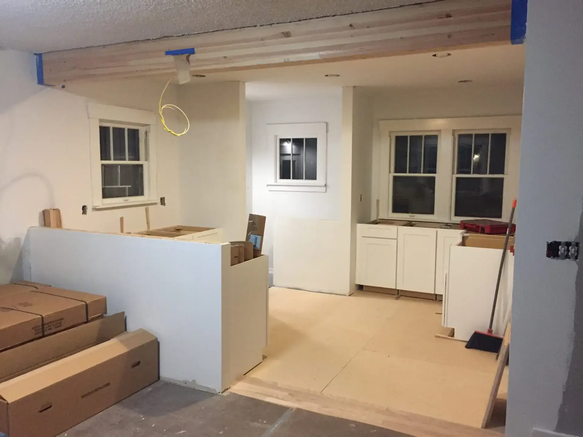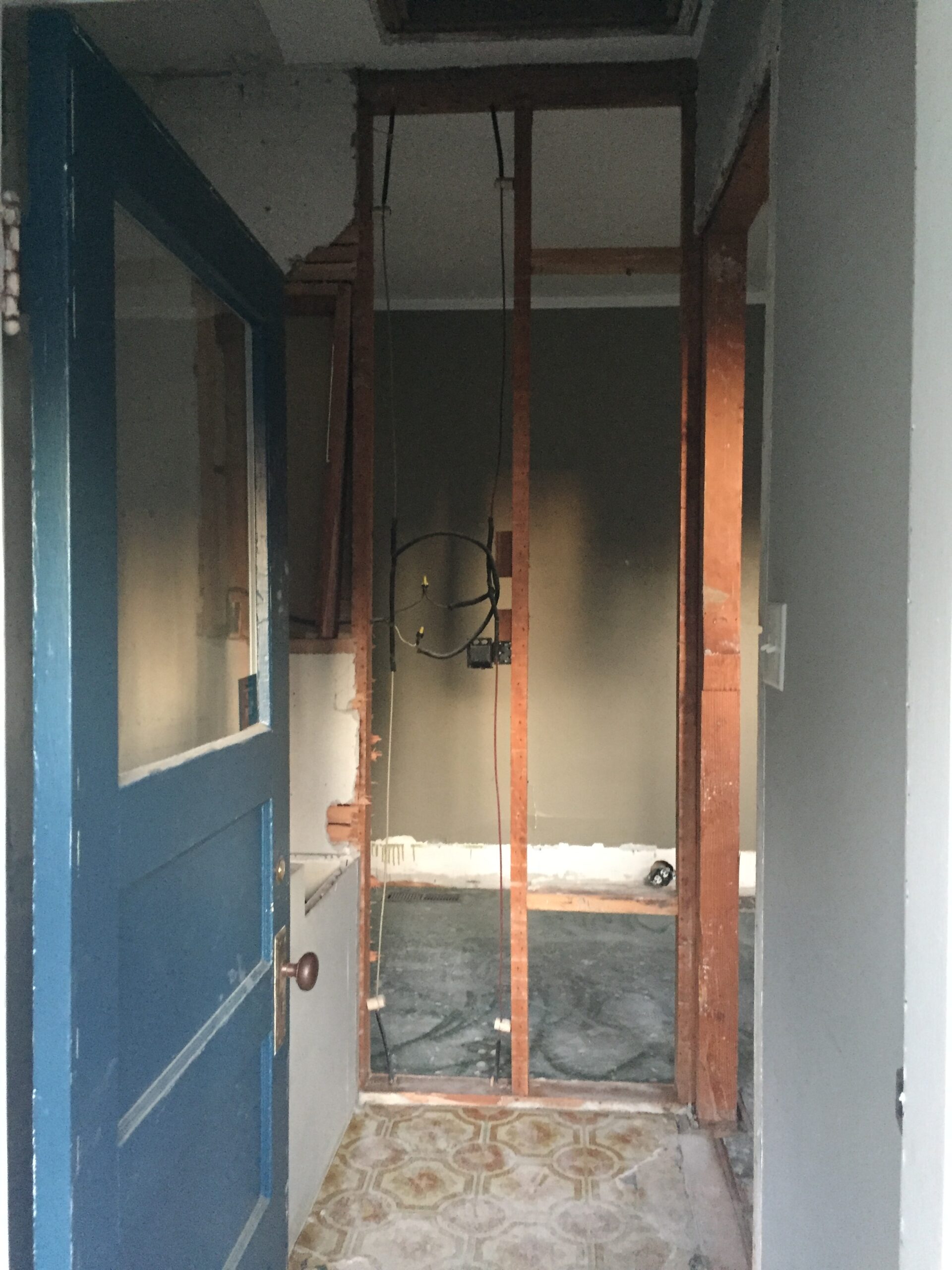 Entry Original Ice Box Original Sink Original Spice Cabinet Original cabinets So long wall quilt! The walls come down. The support beam goes up. Start the pony wall. Dry wall on the bar. Cabinets start going in. The counter tops, stove, and air vent are in! Look at that awesome sink! What a change!