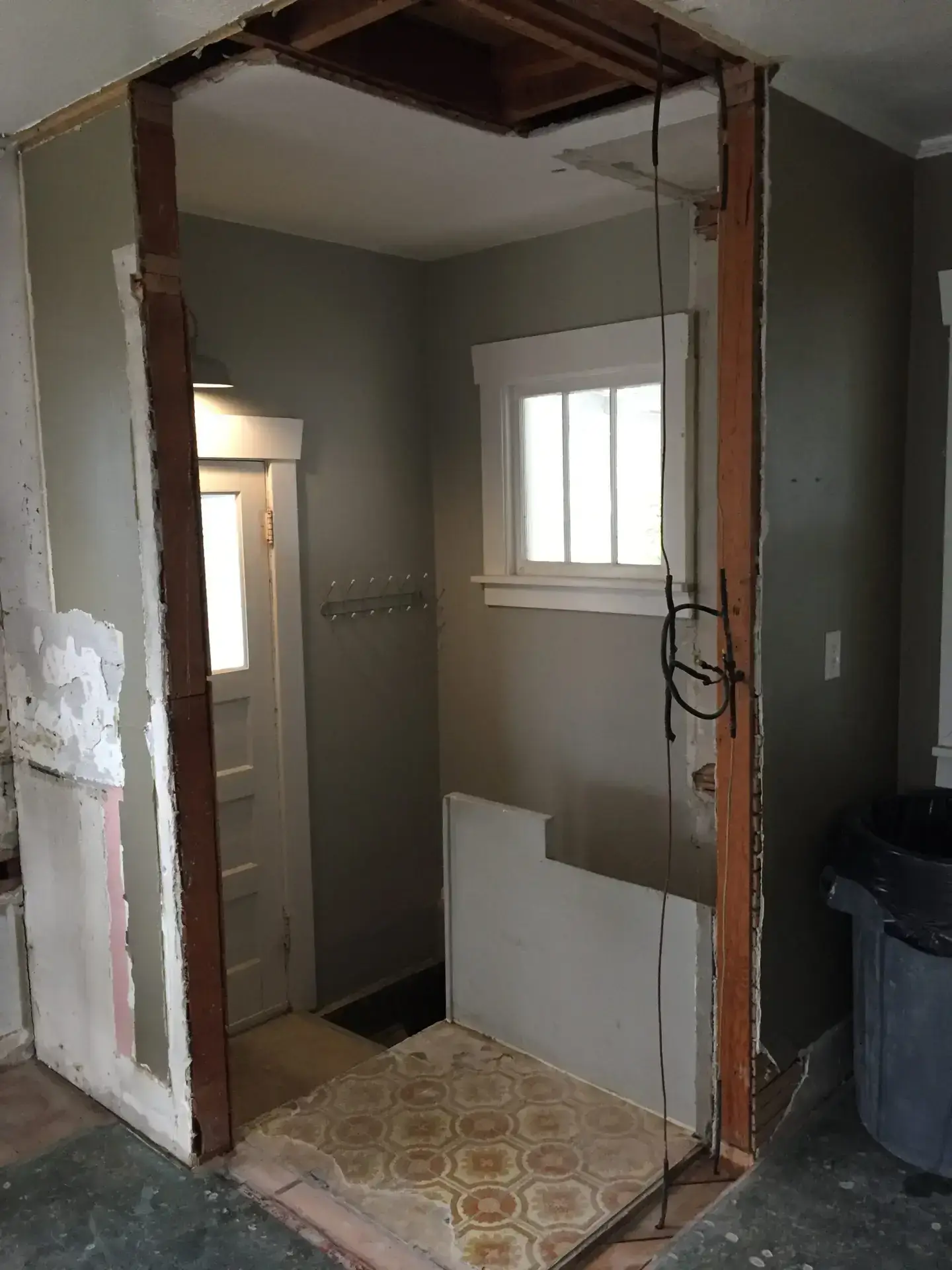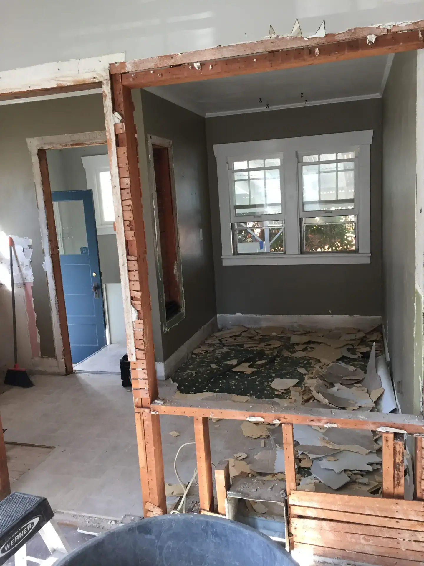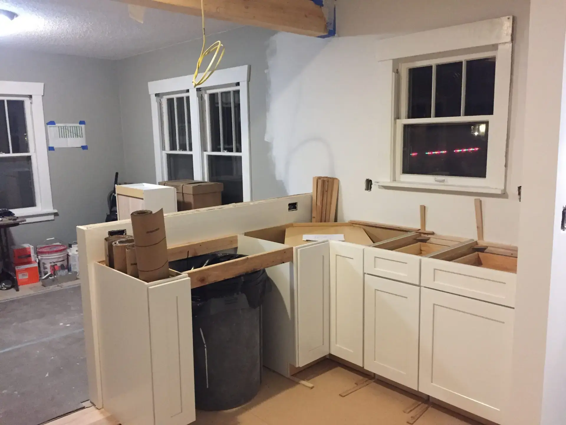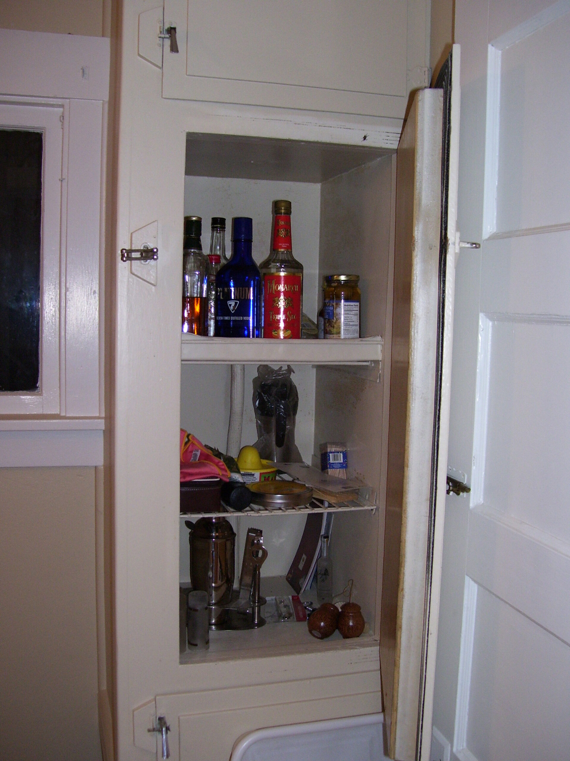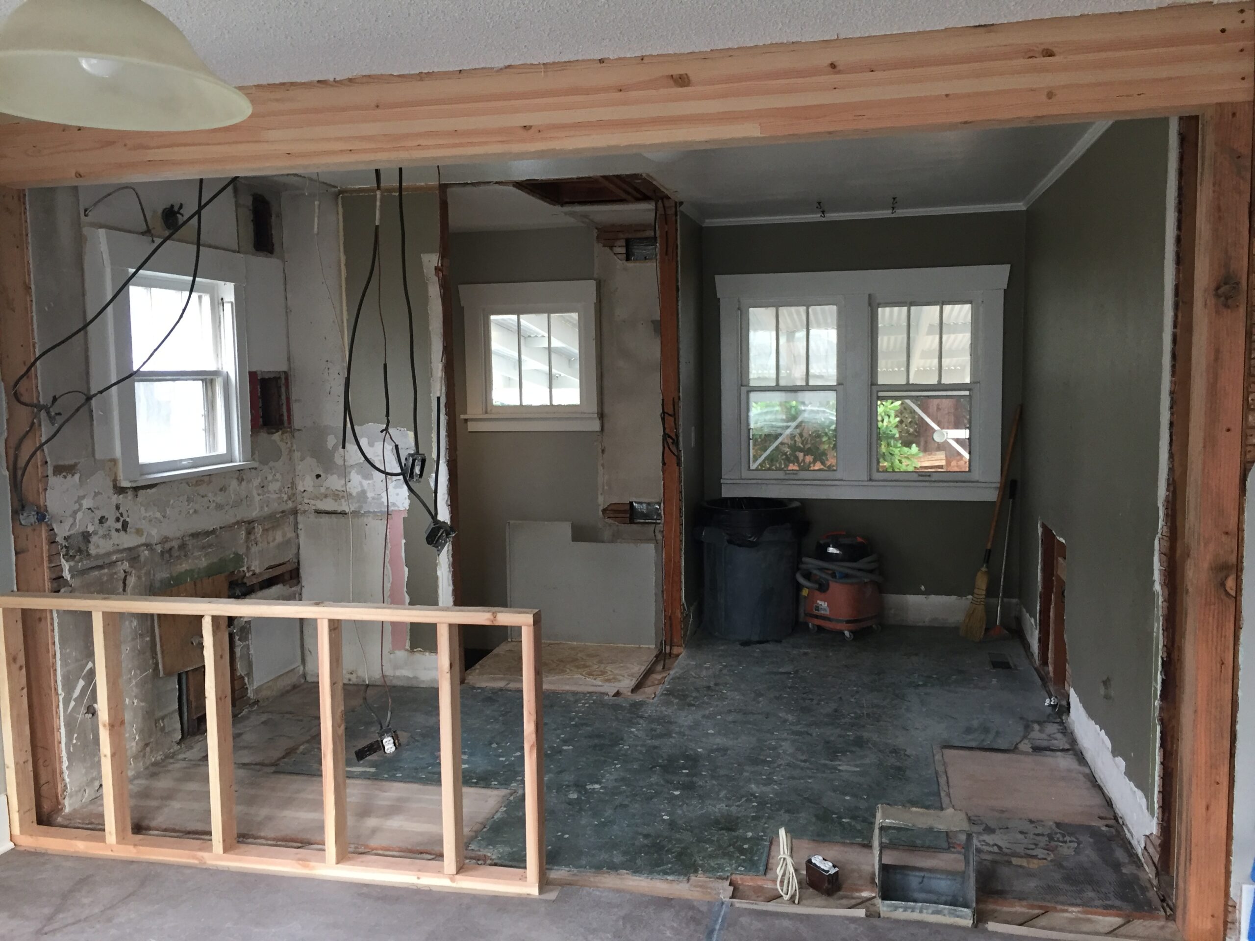 Entry Original Ice Box Original Sink Original Spice Cabinet Original cabinets So long wall quilt! The walls come down. The support beam goes up. Start the pony wall. Dry wall on the bar. Cabinets start going in. The counter tops, stove, and air vent are in! Look at that awesome sink! What a change!