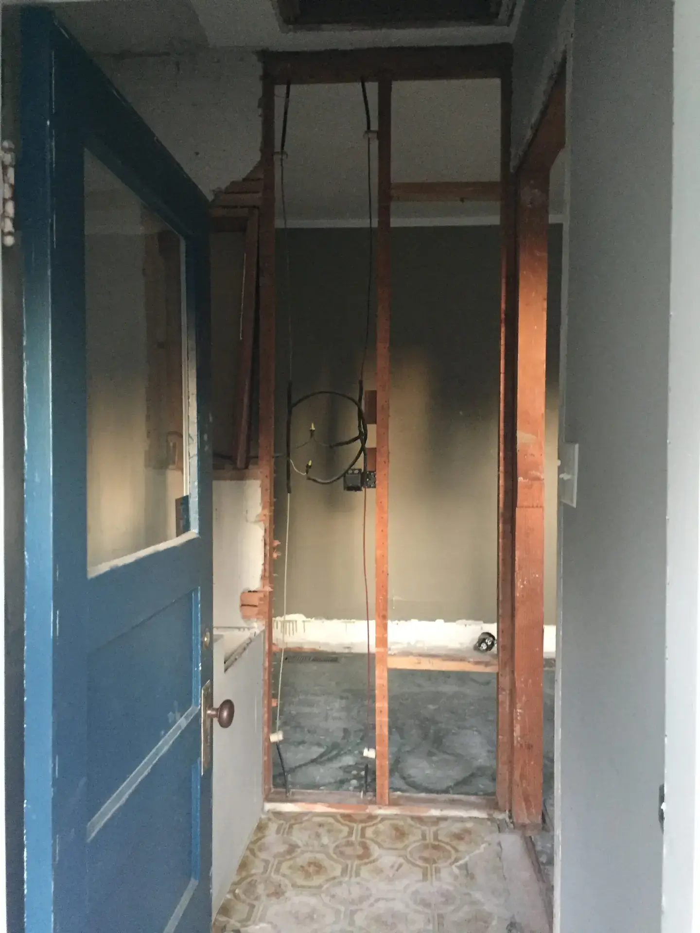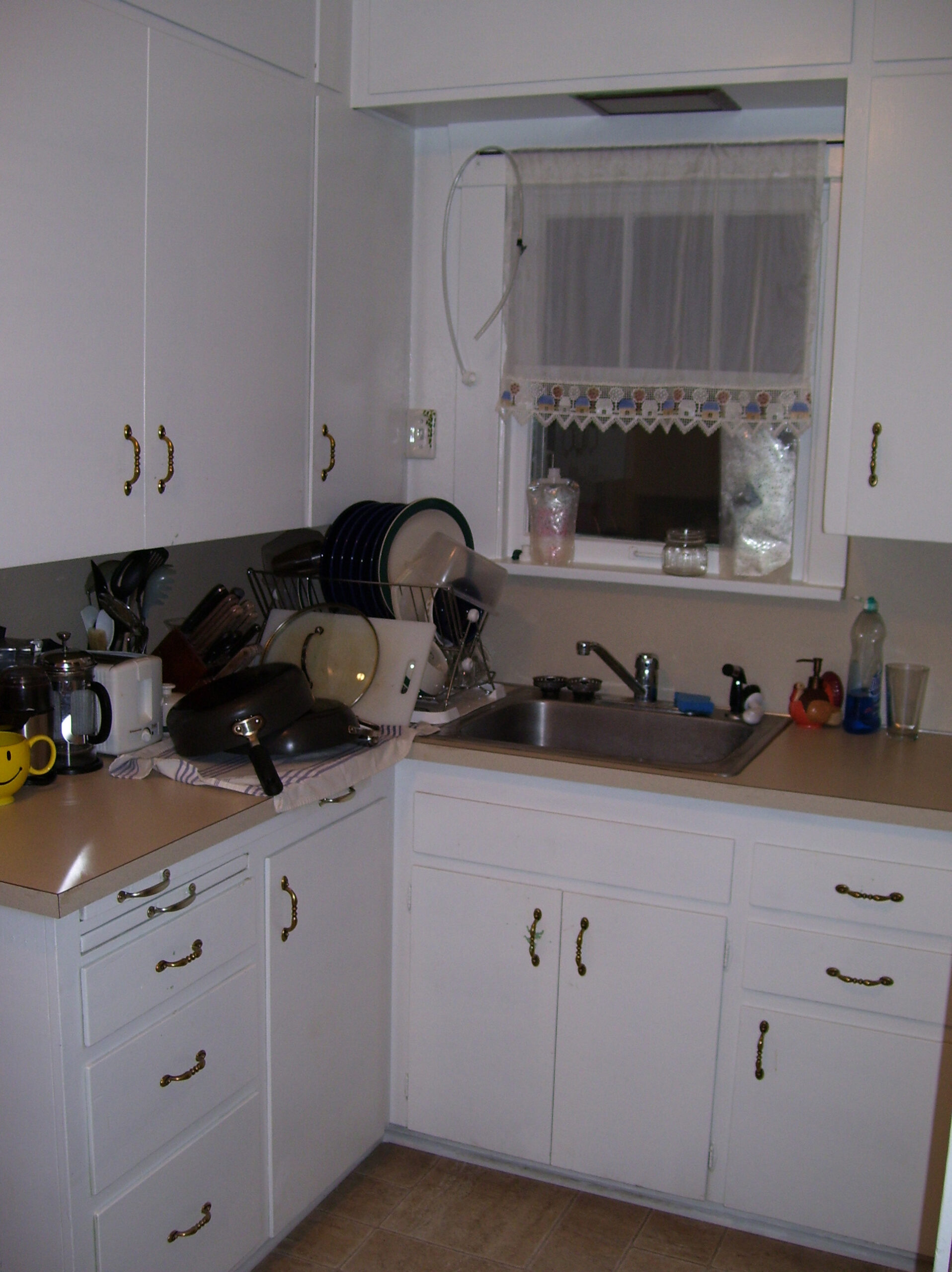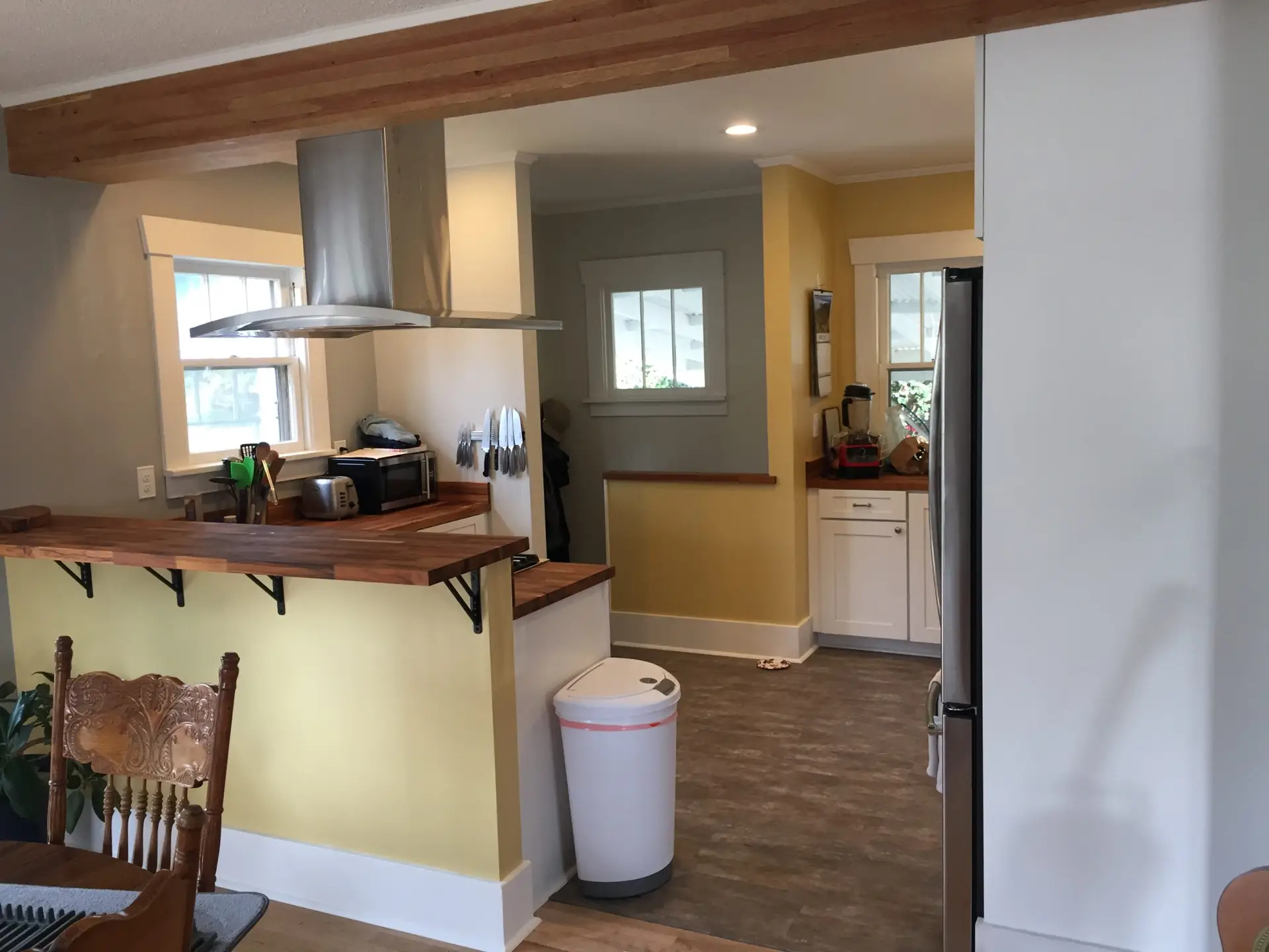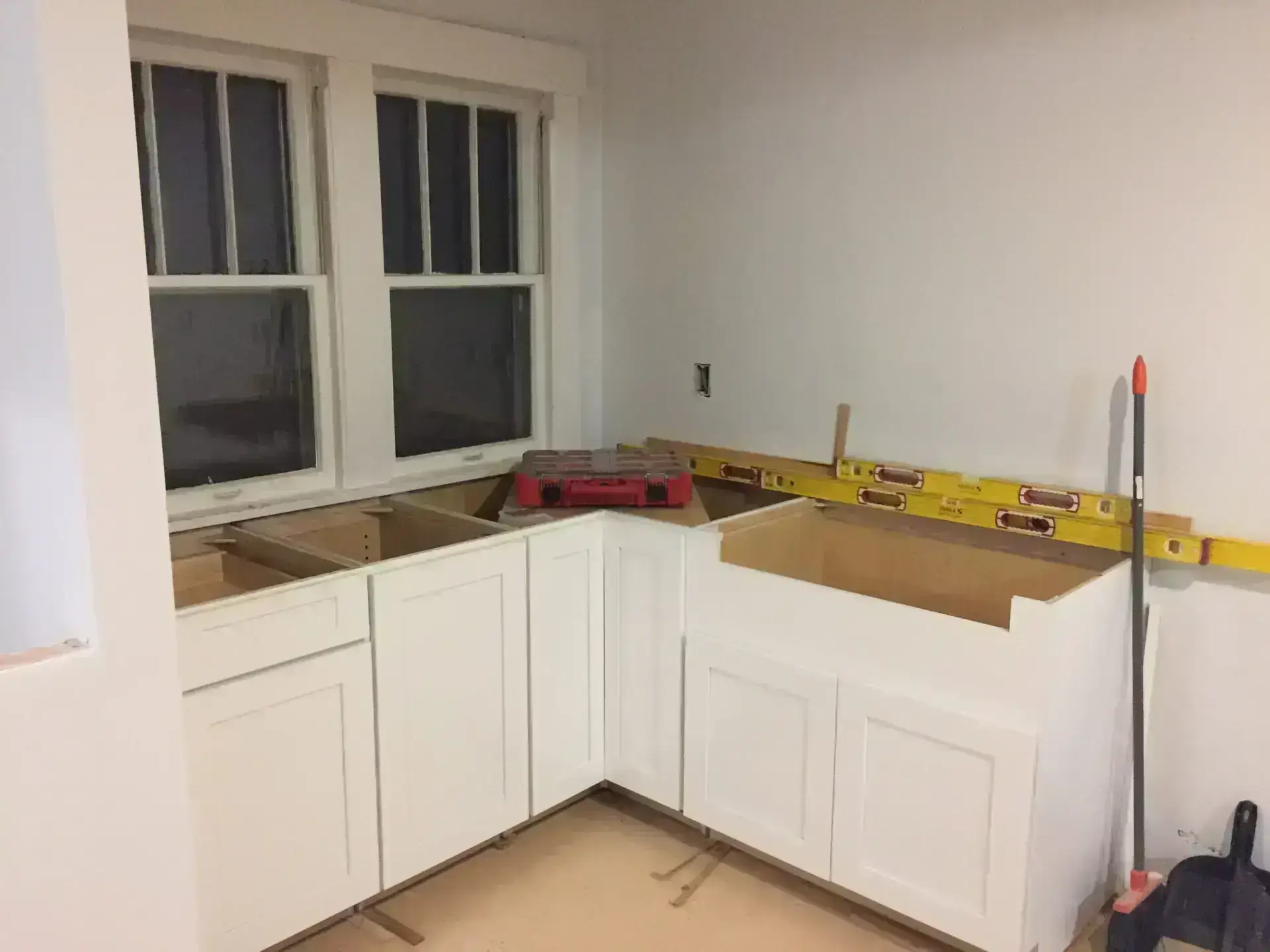 Entry Original Ice Box Original Sink Original Spice Cabinet Original cabinets So long wall quilt! The walls come down. The support beam goes up. Start the pony wall. Dry wall on the bar. Cabinets start going in. The counter tops, stove, and air vent are in! Look at that awesome sink! What a change!