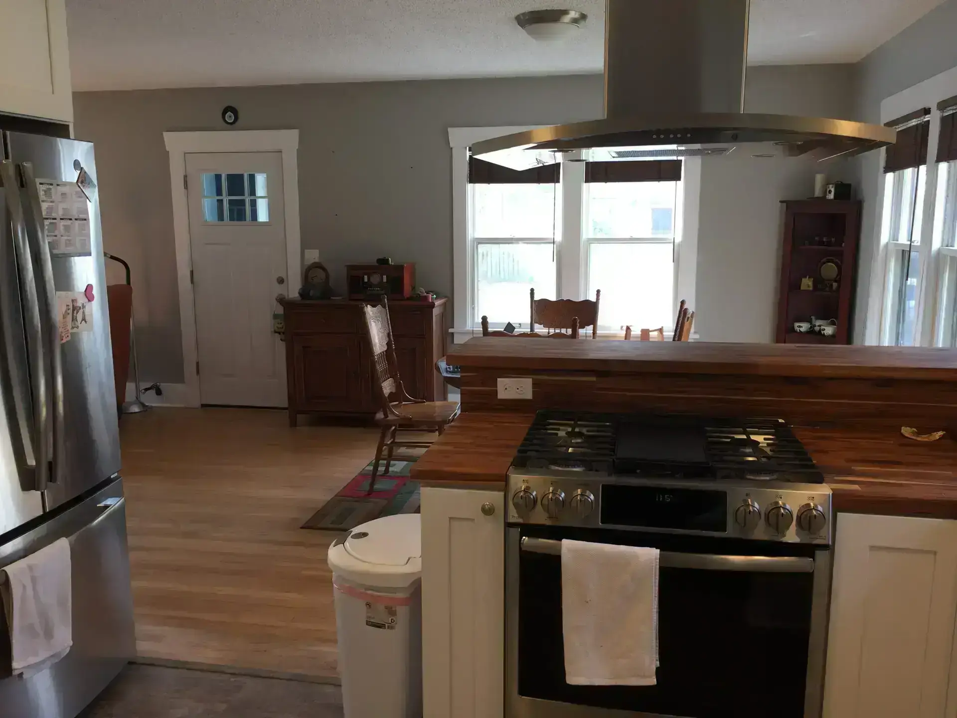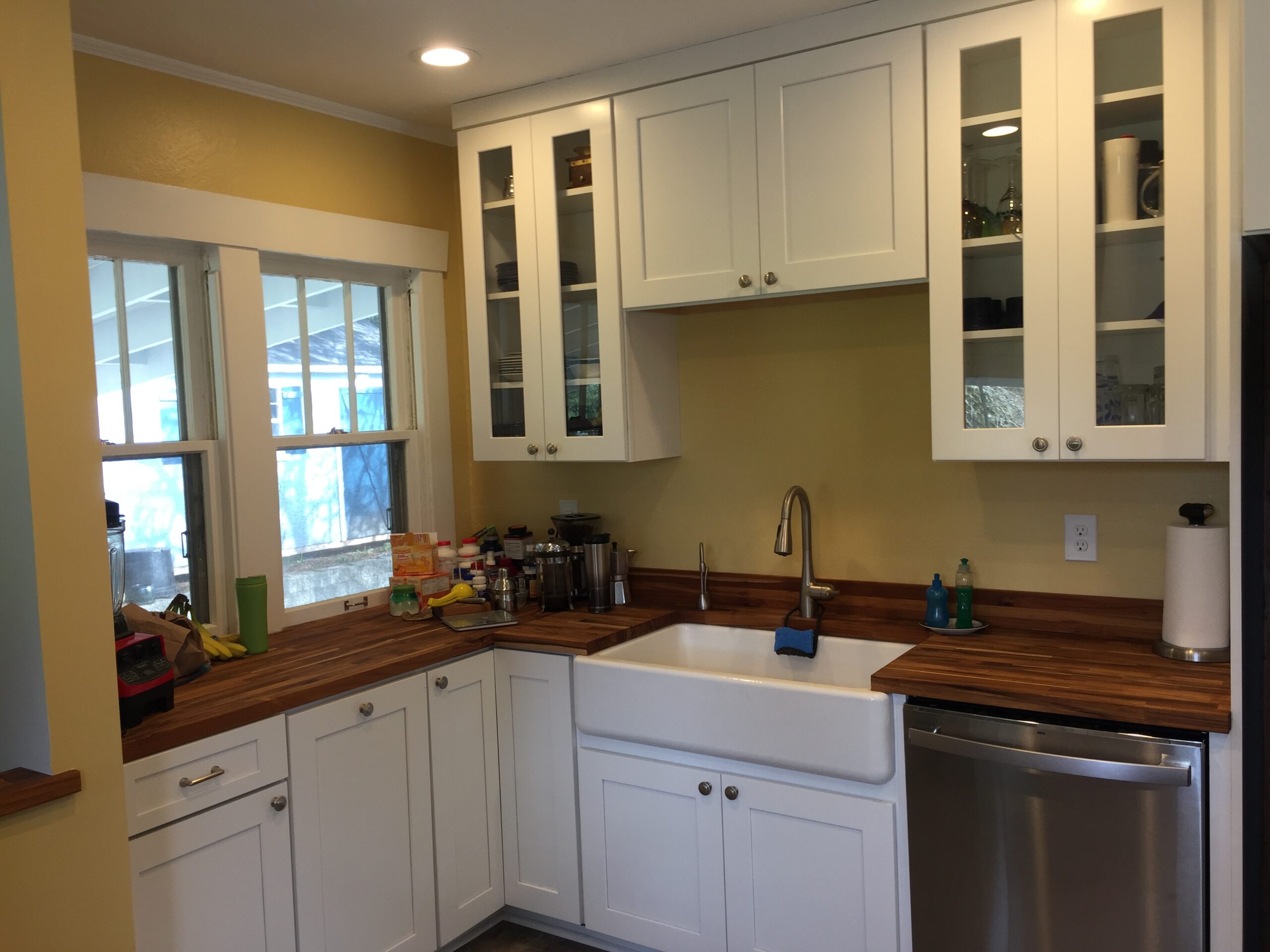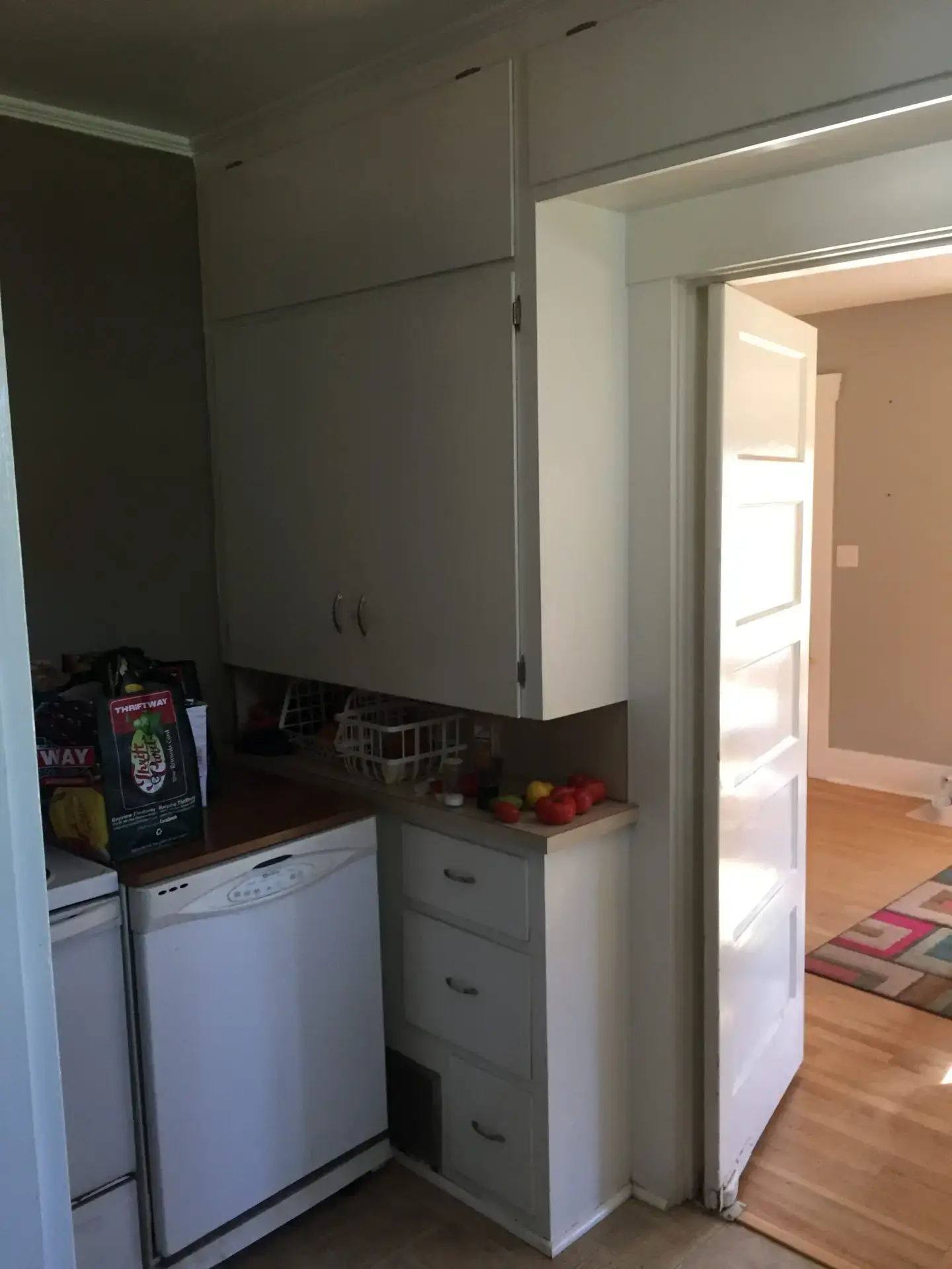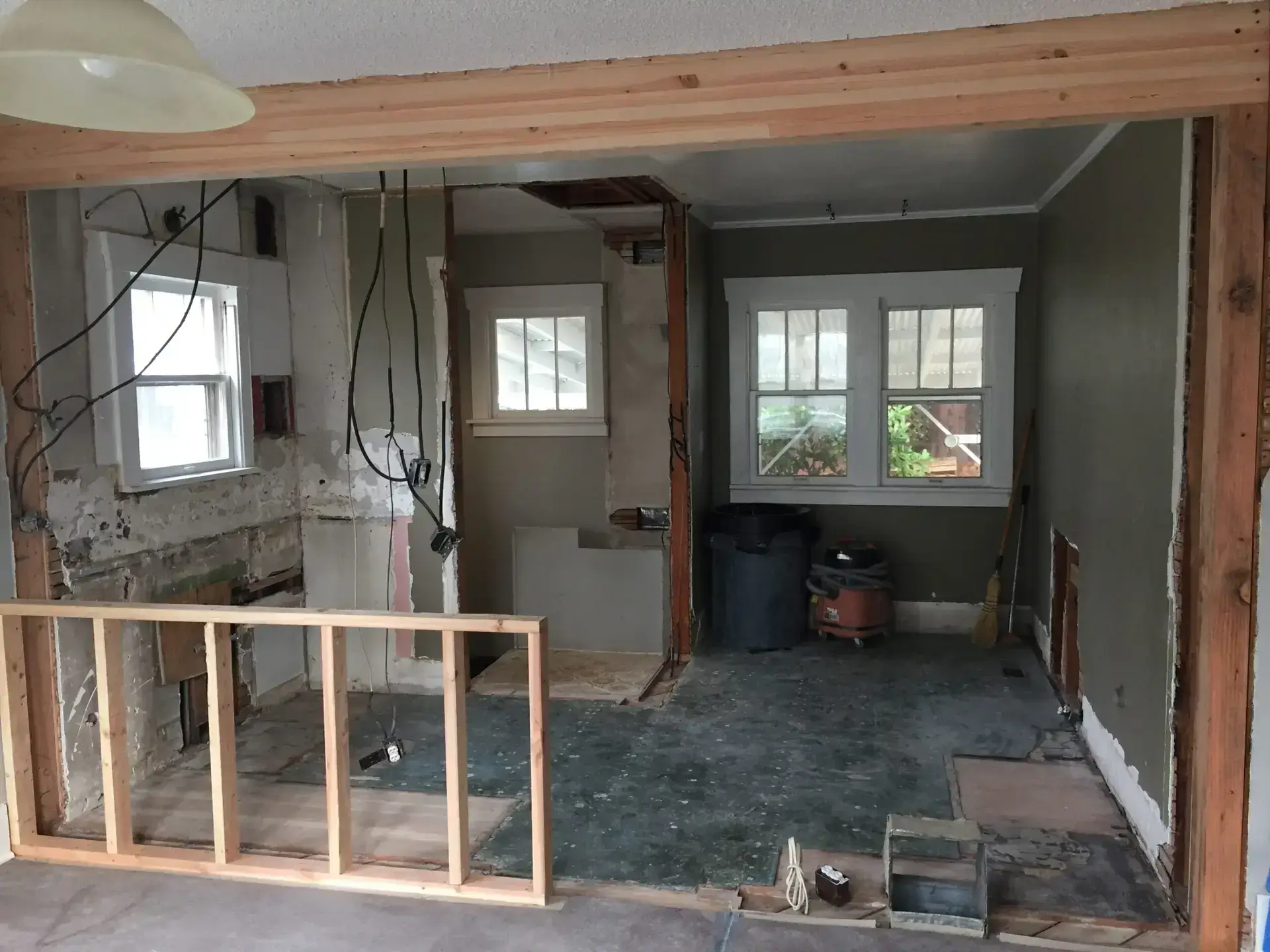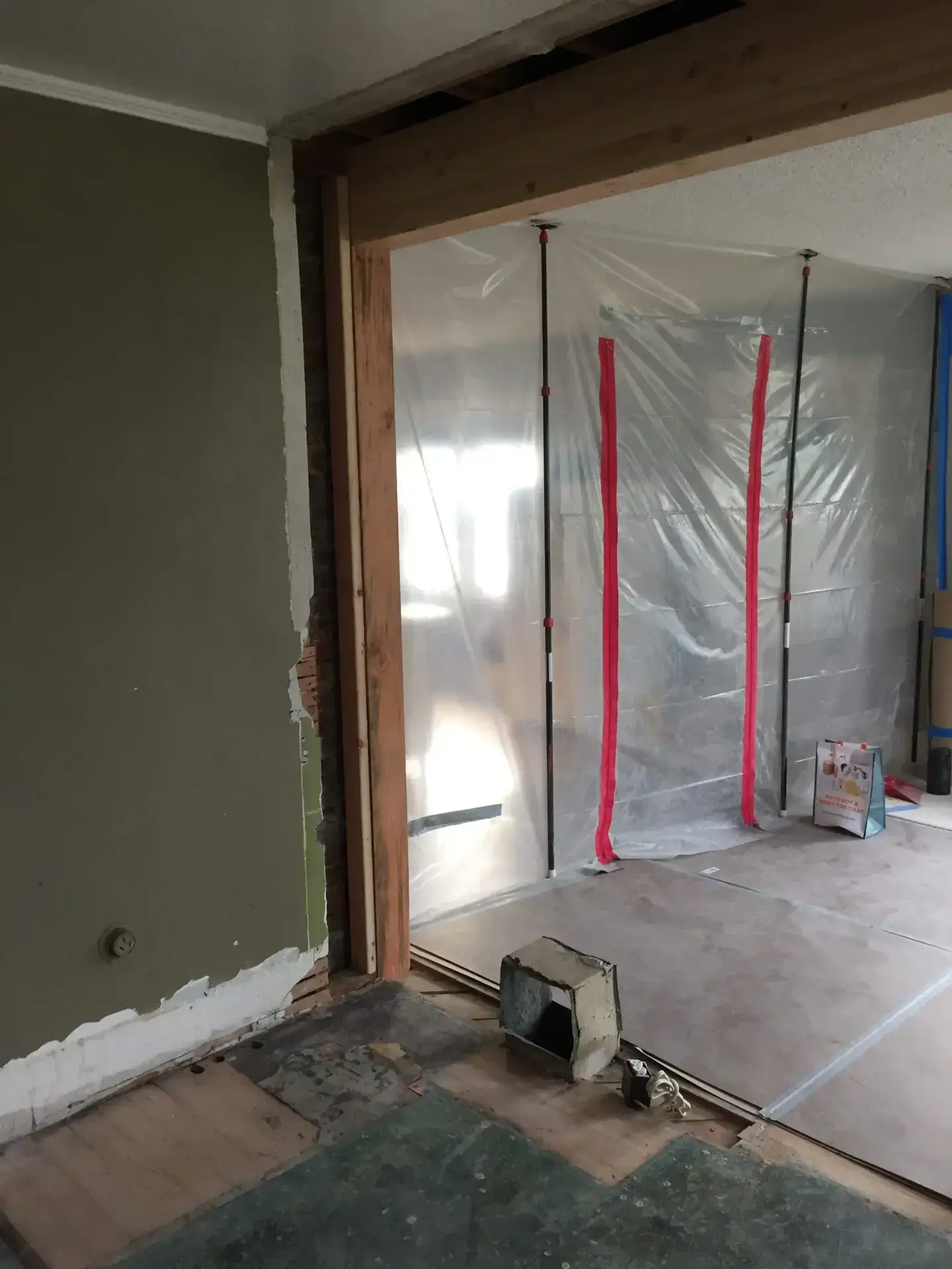 Entry Original Ice Box Original Sink Original Spice Cabinet Original cabinets So long wall quilt! The walls come down. The support beam goes up. Start the pony wall. Dry wall on the bar. Cabinets start going in. The counter tops, stove, and air vent are in! Look at that awesome sink! What a change!