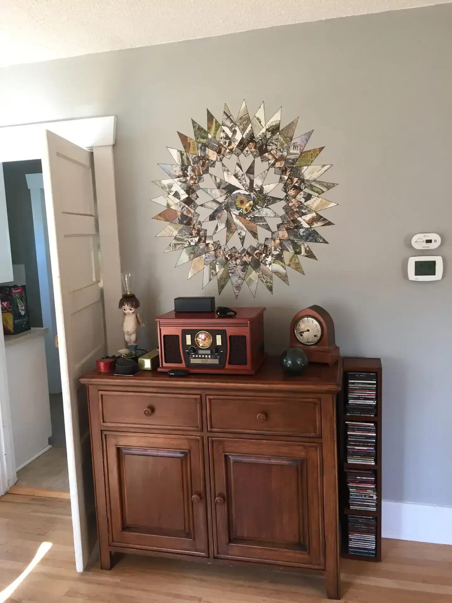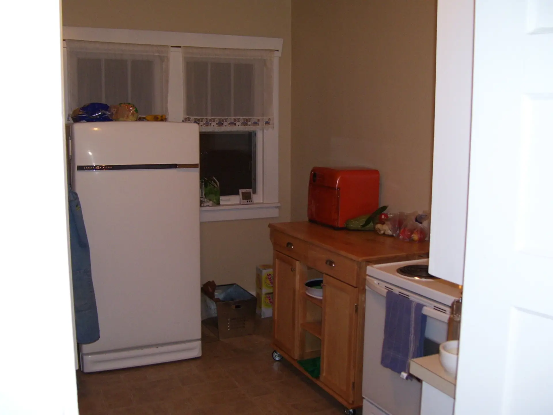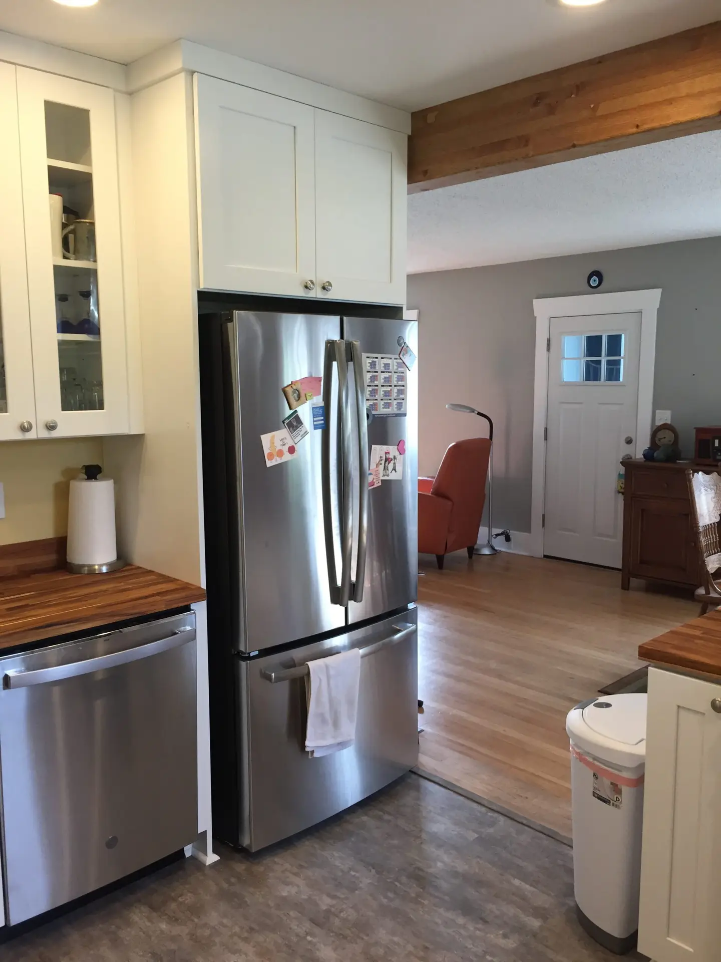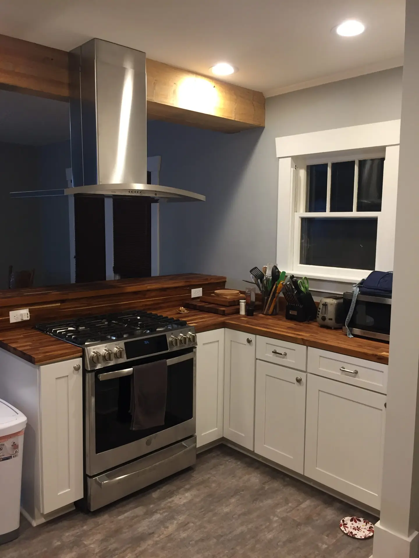 Entry Original Ice Box Original Sink Original Spice Cabinet Original cabinets So long wall quilt! The walls come down. The support beam goes up. Start the pony wall. Dry wall on the bar. Cabinets start going in. The counter tops, stove, and air vent are in! Look at that awesome sink! What a change!