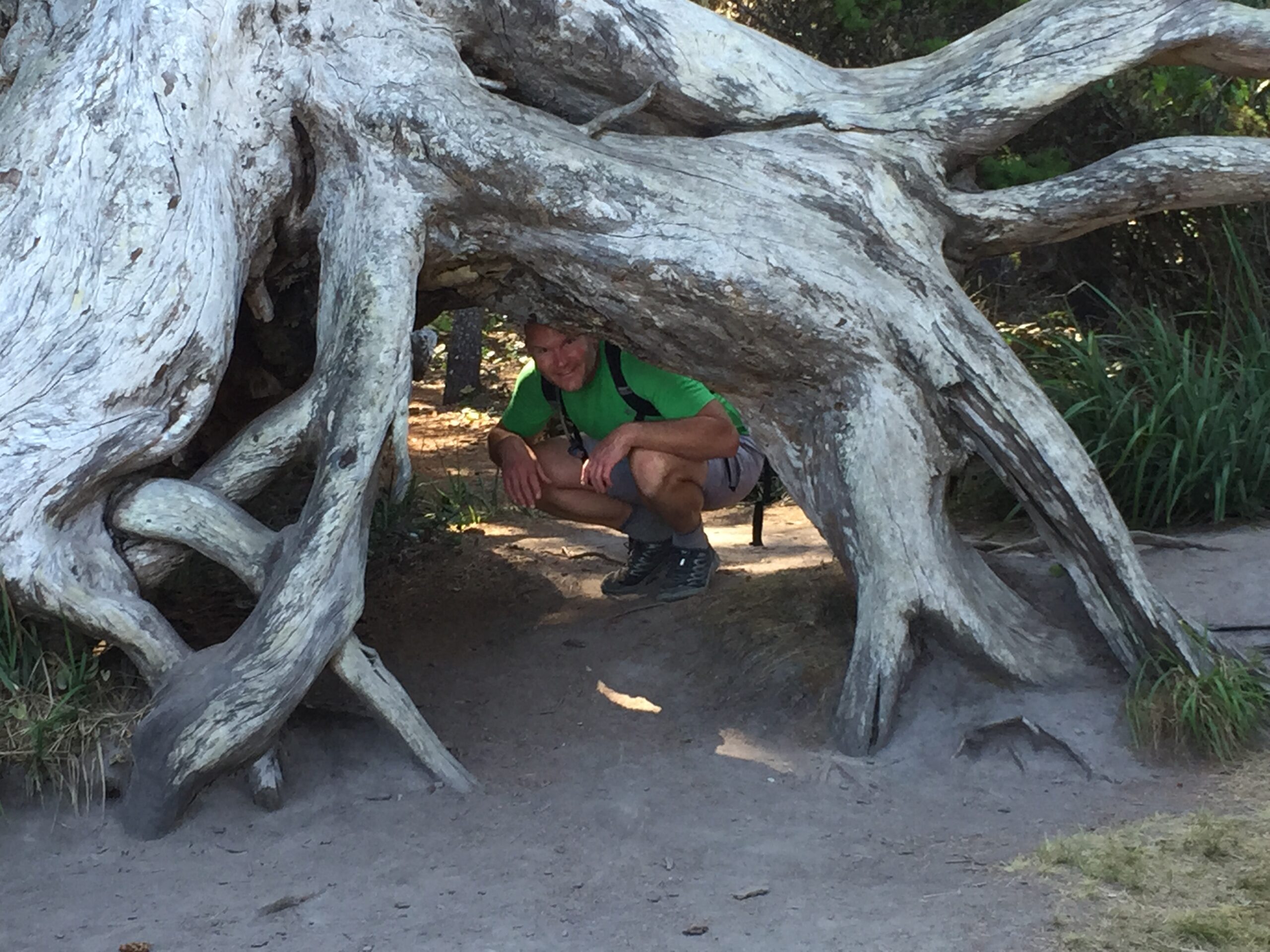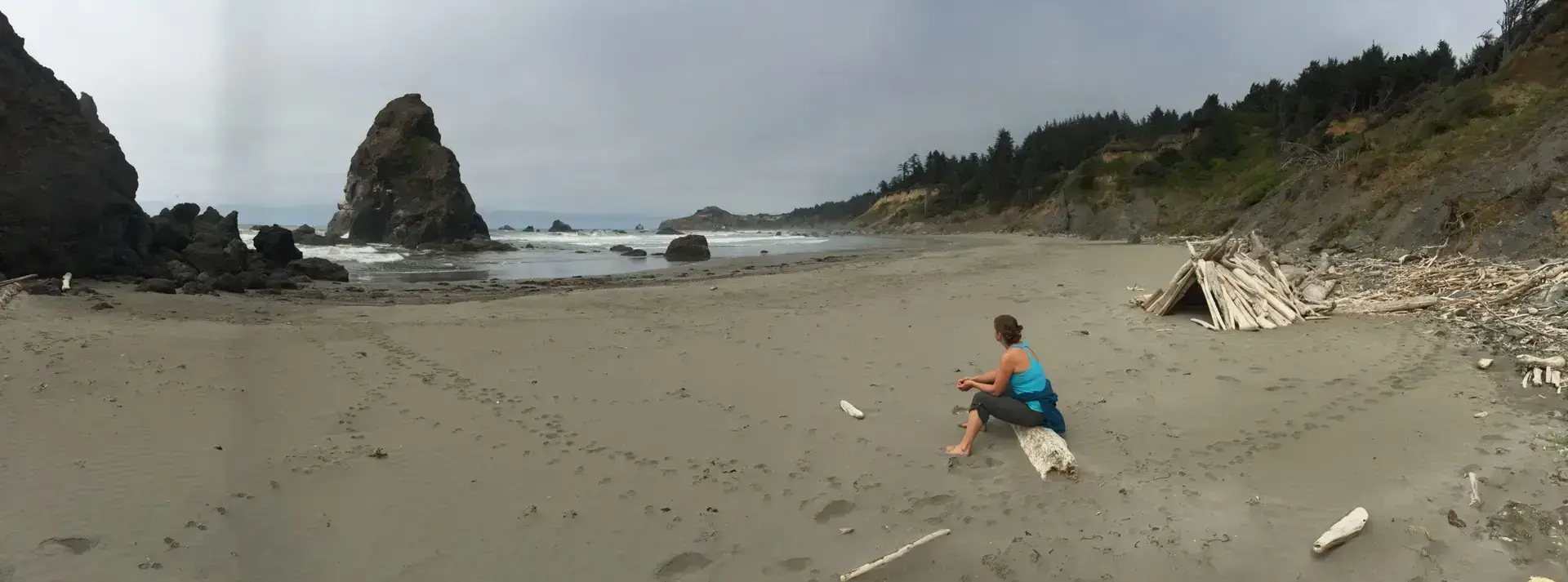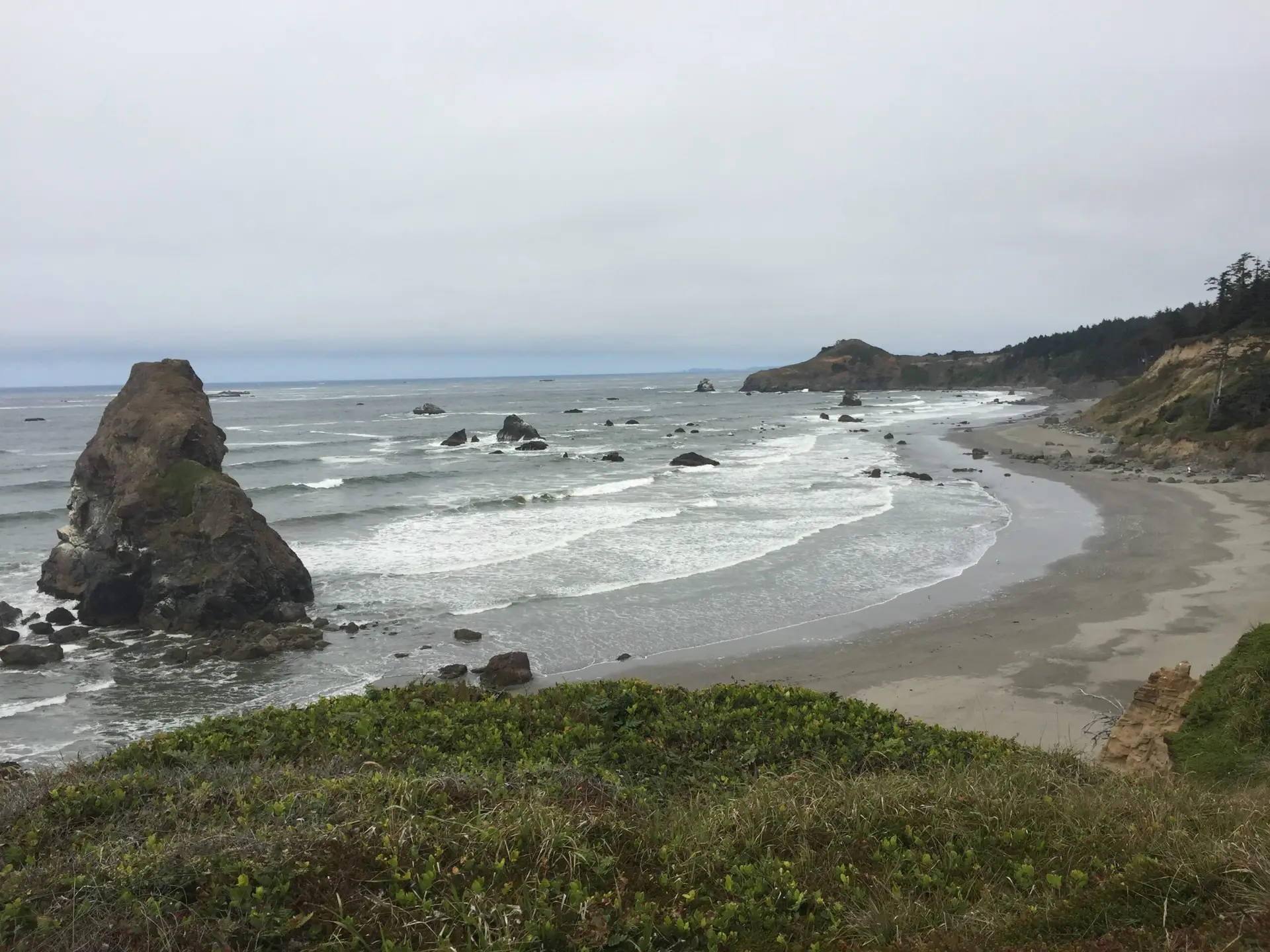 We stopped at Humbug Campground because in our search for hikes around the coast, Humbug Mountain came up. It’s not long, only 6 miles round-trip, but it at least had some elevation and some distance. We drove past the Humbug Mountain trail sign, and it said they also had camping, so we pulled in. We lucked out, and they even had a tent camp spot available. Experience taught us that Oregon Coast camping is tricky. It my look like a site is available, but it may have already been booked, they just haven’t posted the reserved sign. We found a site that would work, checked the reservation board, it was open, so we went to book it. We wanted two nights, so I called the reservation number provided to also book for the next night. I went through the whole reservation process, and they told me the total was $25. This was more than the posted night fee, so I asked why. I was told there was an $8 registration fee!! This had not been communicated before I made the call, or went through the process, so I was a little upset. Luckily, I hadn’t given my credit card info yet, so I canceled the reservation and hung-up. While I was telling Jamie about what happened, and we were complaining about their bullshit system, and a nice park-helper – with a waxed, curled mustache – came up and asked it we needed help. We told him the story, and he said not to worry. We could just ask the part host if the site was open, and they’d help us. We ran into them later, and they helped. Super nice people, and we had the spot for two nights. Woohoo! So we set up camp, grabbed a drink and some water, and headed down to the beach. We hung-out watching the waves for awhile, then headed back to camp. When we arrived, we had some new neighbors, and we started up a conversation. They were form Ontario, Canada, had flown into Seattle, rented a car, and were driving down to San Francisco for two weeks. Then they’d fly home from San Fran. They were a very nice couple, left their business cards on our table the next morning, so we’ll probably email them to say hi.