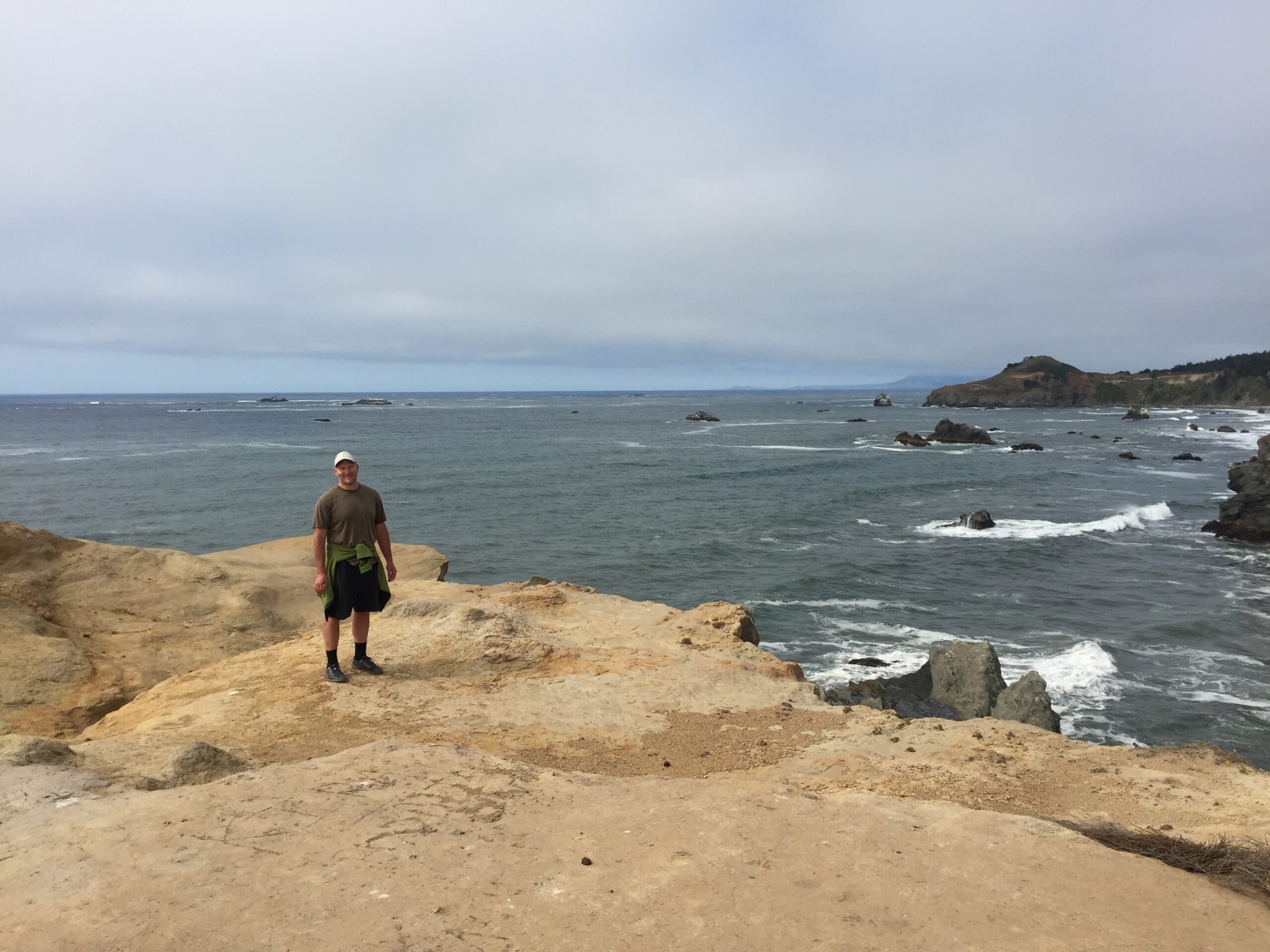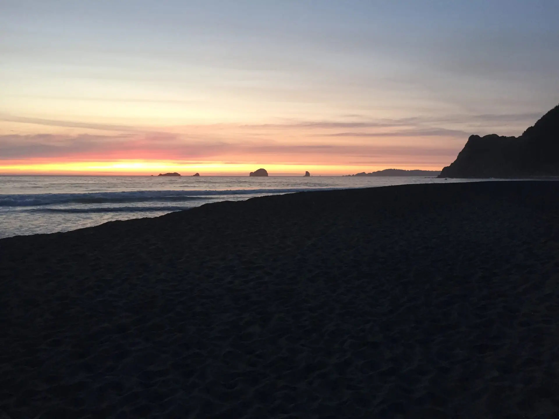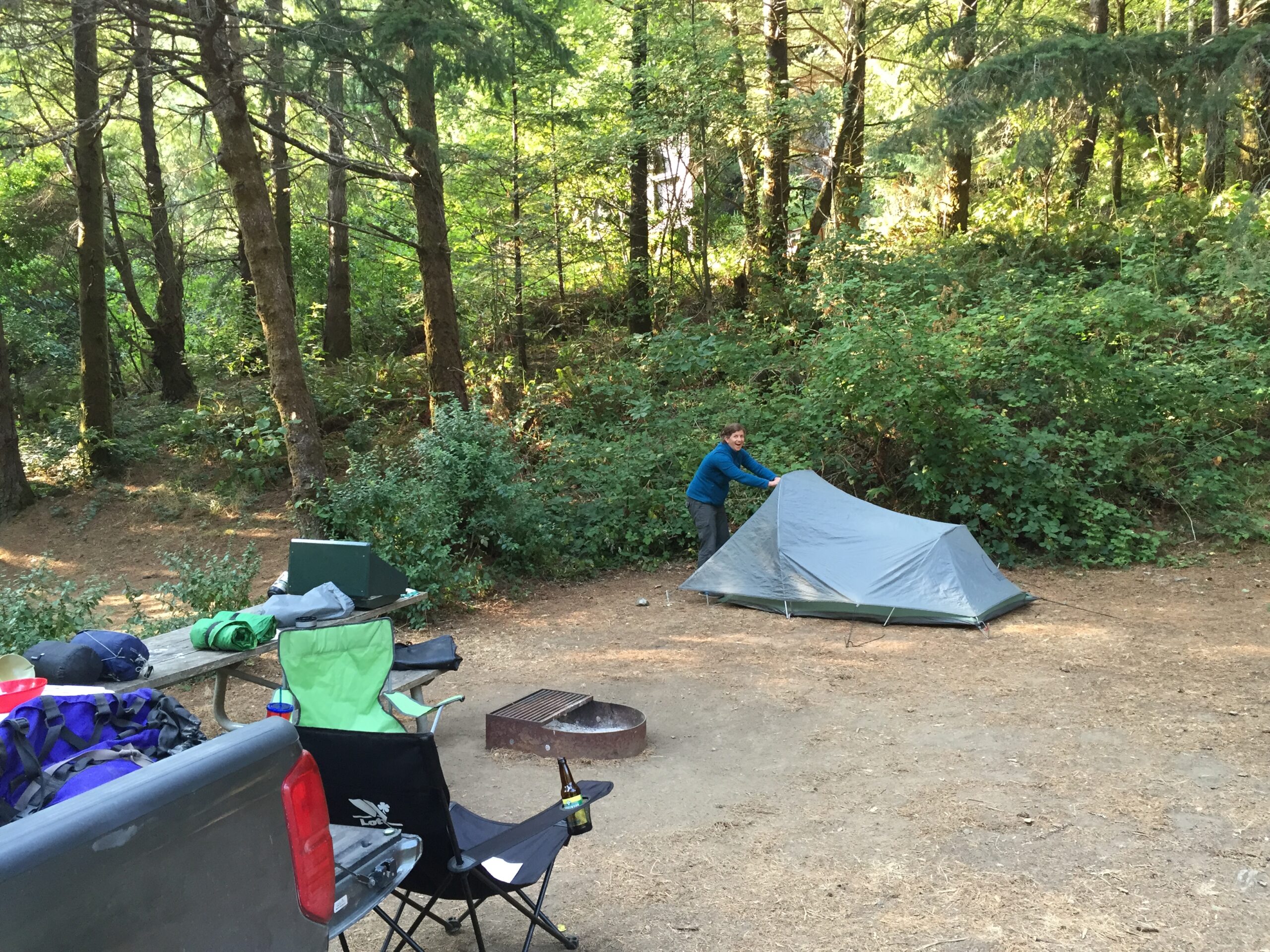 We got up the next morning and headed North on 101 to Coos Bay. We were going to walk the Blacklock Point trail, then see if we could find Sunset Bay Campground. Blacklock Point trail turned out be about 8 miles. It was a lovely walk, and had beautiful scenery. We made it back to the car, then stopped in Coos Bay for supplies. Then west on Hwy 540 to the campground – beginning the hour of frustration. We waited for the camp host to be available, then asked for some camp spots that would be available for the next two nights. He highlighted them on the map, so we went to find them. What a shit-hole. Not only did a lot of the camps just have their garbage spewed everywhere, but there was no space or division (like bushes or trees) between the spots. Of course, Jamie and I are already getting irritable because we’re around lots of people, but also seeing their crap just helps bump it up a frustration level. So we decided to drive back to Coos Bay, then head up and west on 241 to see if we can’t find something in the North 10 mile area. Now, before we had even hit Coos Bay – totally frustrated – I see a sign saying left to Bastendorf Campground! I yell at Jamie to turn and check it out. They still had empty tent spots, which had nice bush divisions between each spot – so we went to the Park Host to take our spot. It was a bit of a maze to actually find someone who could help us, but we finally did. He was super nice, and our preferred spot was available both nights. So we pulled in, set up camp, and even got to end the day with a campfire. Whew.