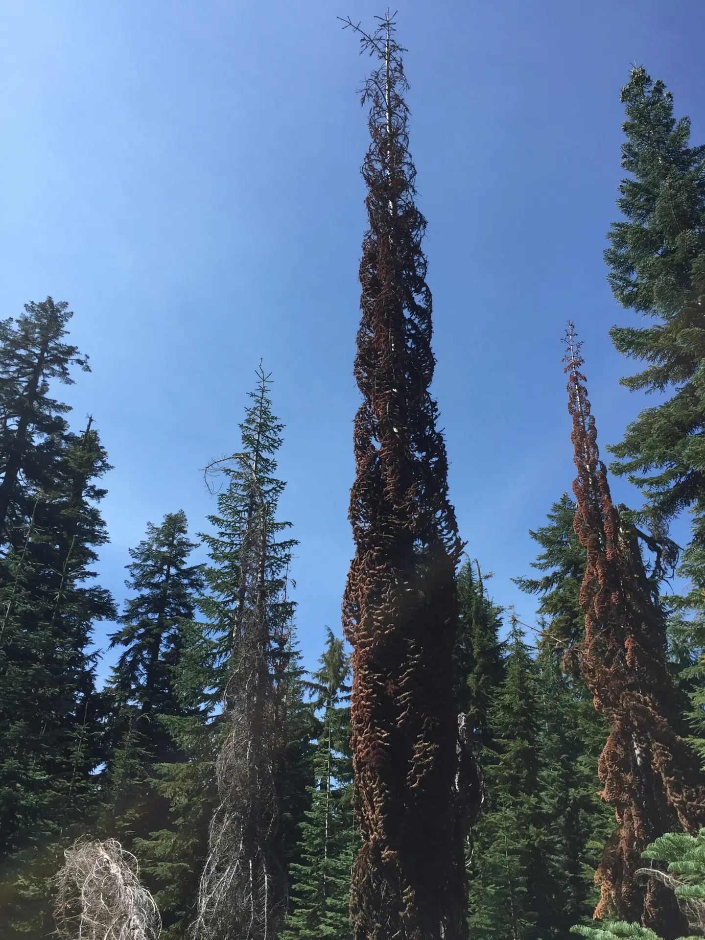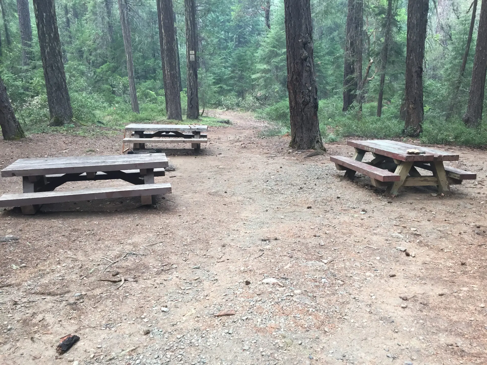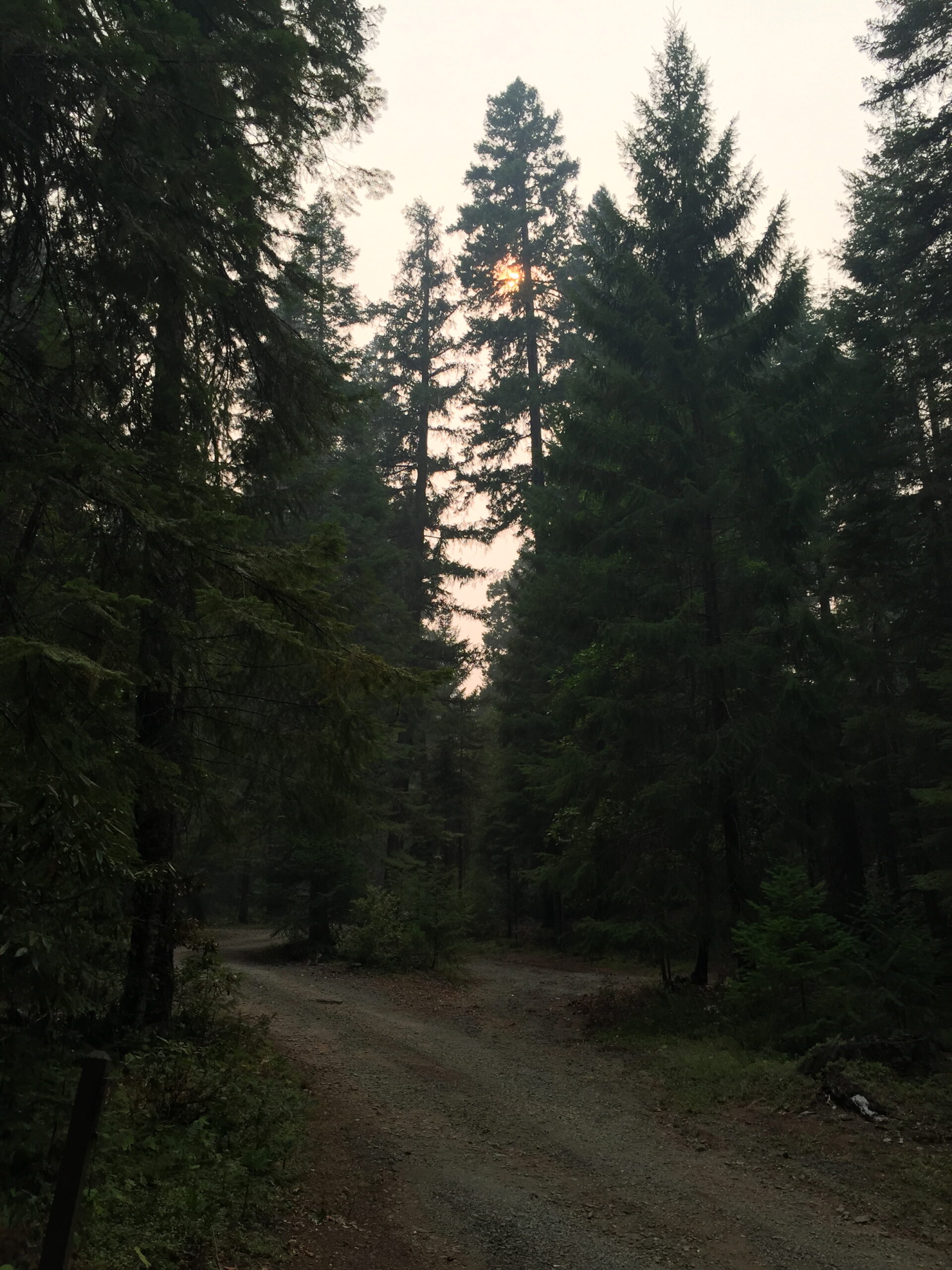 After an hour or two of driving, we were on Happy Camp road looking for the Tannen Lakes trail sign. We didn’t see one, so we continued down the road looking for a camp. We finally came upon West Branch campground, and turned in to check it out. I don’t know if it was the smoke in the air, the old Pepsi can and branches still sitting on the tables, or the fact that NO ONE else was there, but it felt like the campground of the damned! After driving around a curve, we saw and RV, and a guy walking his dog outside of it. We stopped to talk to him, and he let us use his map to see if we could figure out where we lost track. We couldn’t but he was really nice, and it was getting late, so we decided to camp and reevaluate our plan in the morning.