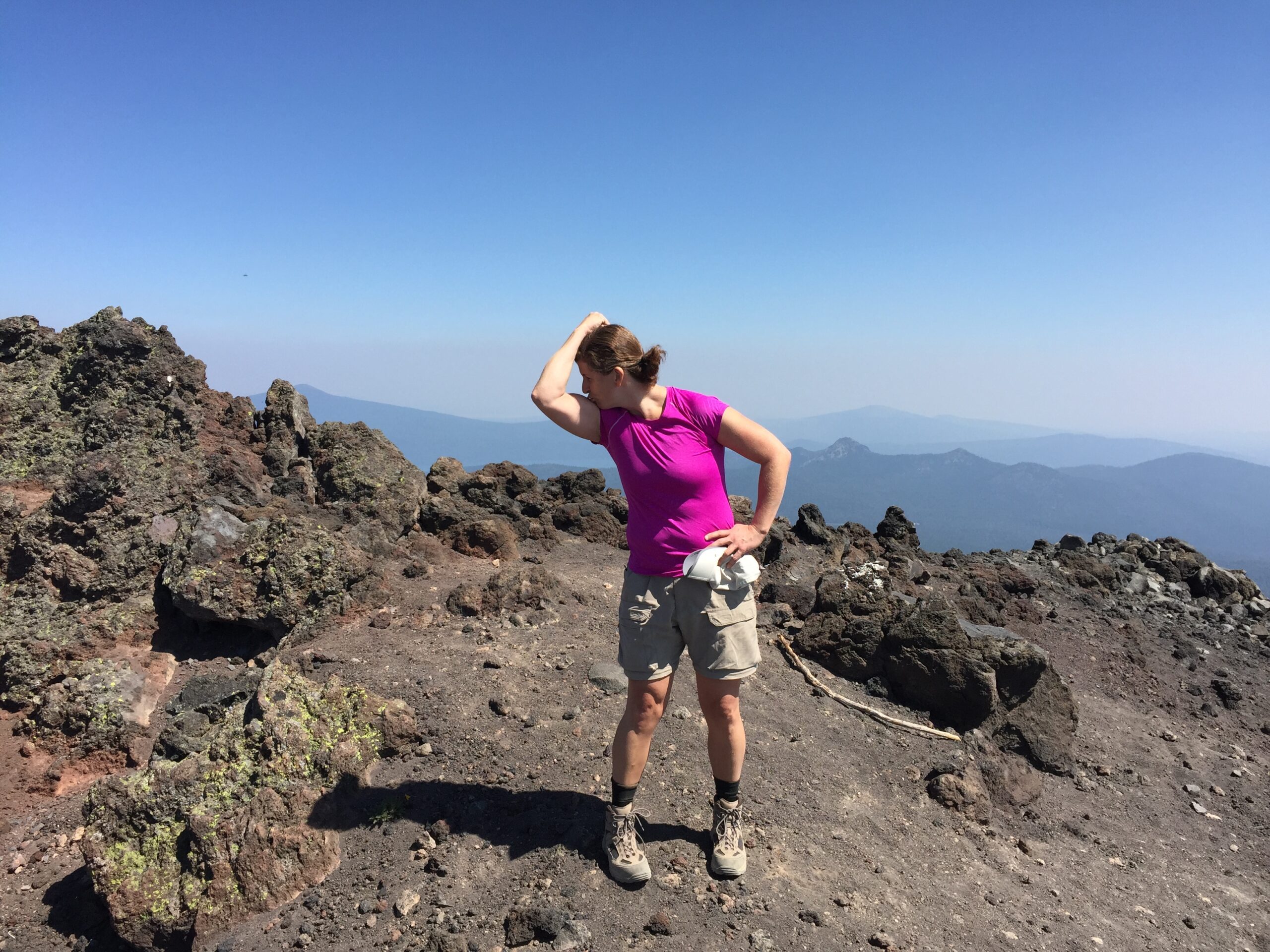 On Wednesday morning, we got up and hit the road for Diamond Peak. It’s 12 miles round trip, and it’s listed as difficult, but it was brutal! The last 1 1/2 miles to the first top was just a scree climb – rocks slipping out from under you at every step. We hit one peak, and could see another a little higher at what looked like maybe 1/2 mile. We stopped for a break – an apple and split a peanut butter bar – then went for the scramble to the top.