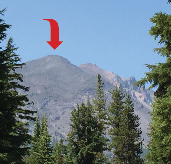 The red arrow marks the summit of Diamond Peak as seen from the start of the trail.
