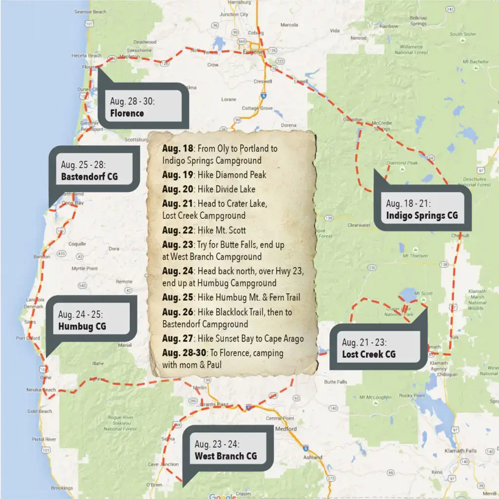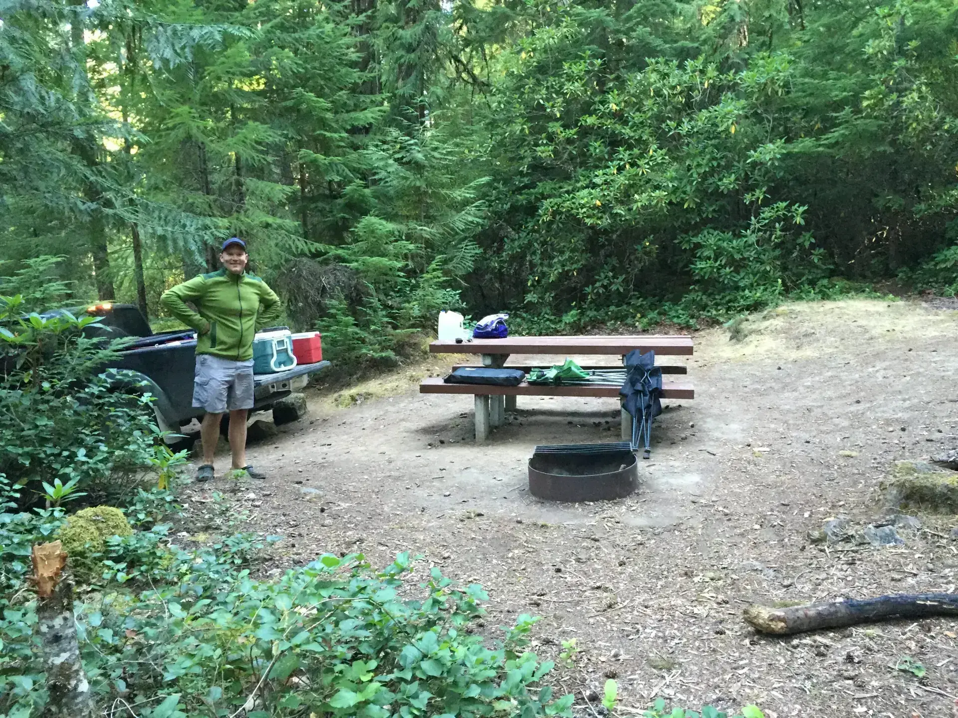 We left Olympia on Tuesday morning, and stopped in Portland to see Grandma. Then headed down I-5 to Eugene, taking Highway 58 to Oaksville. We stopped at the Ranger Station to grab a couple maps, stopped at Ray’s for water, ice, and sausages, then continued to Forest Service Road 23. We took the turn to FS 21 so we could make it to Indigo Springs for free camping. We stopped at a couple others along the way, but my cheapness won out, and we drove on. Success! Free and to ourselves!