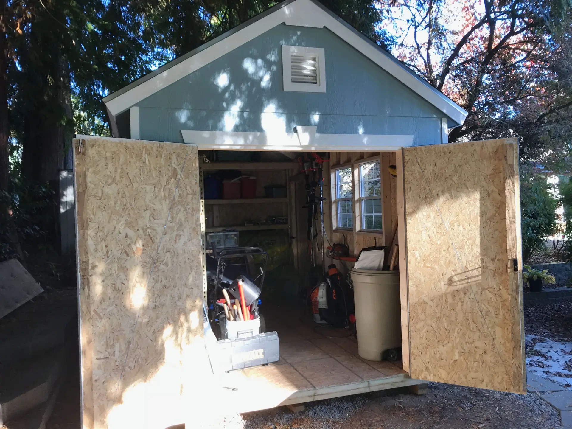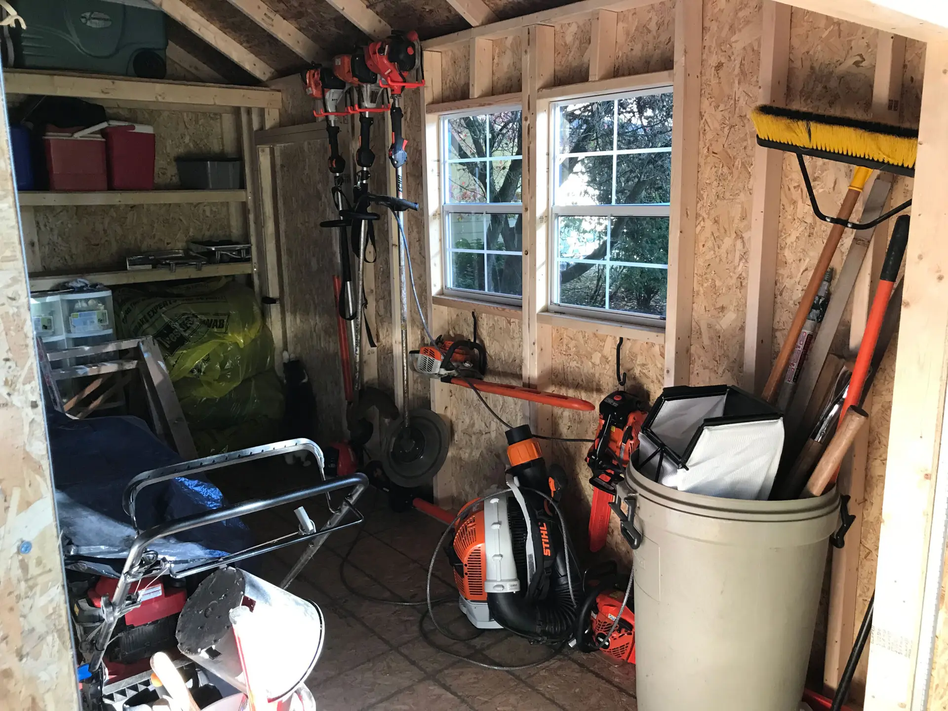 Shed Construction Jamie’s landscape business was starting to get busy, and we needed more space to store equipment. We bought a kit from Costco and got to work.