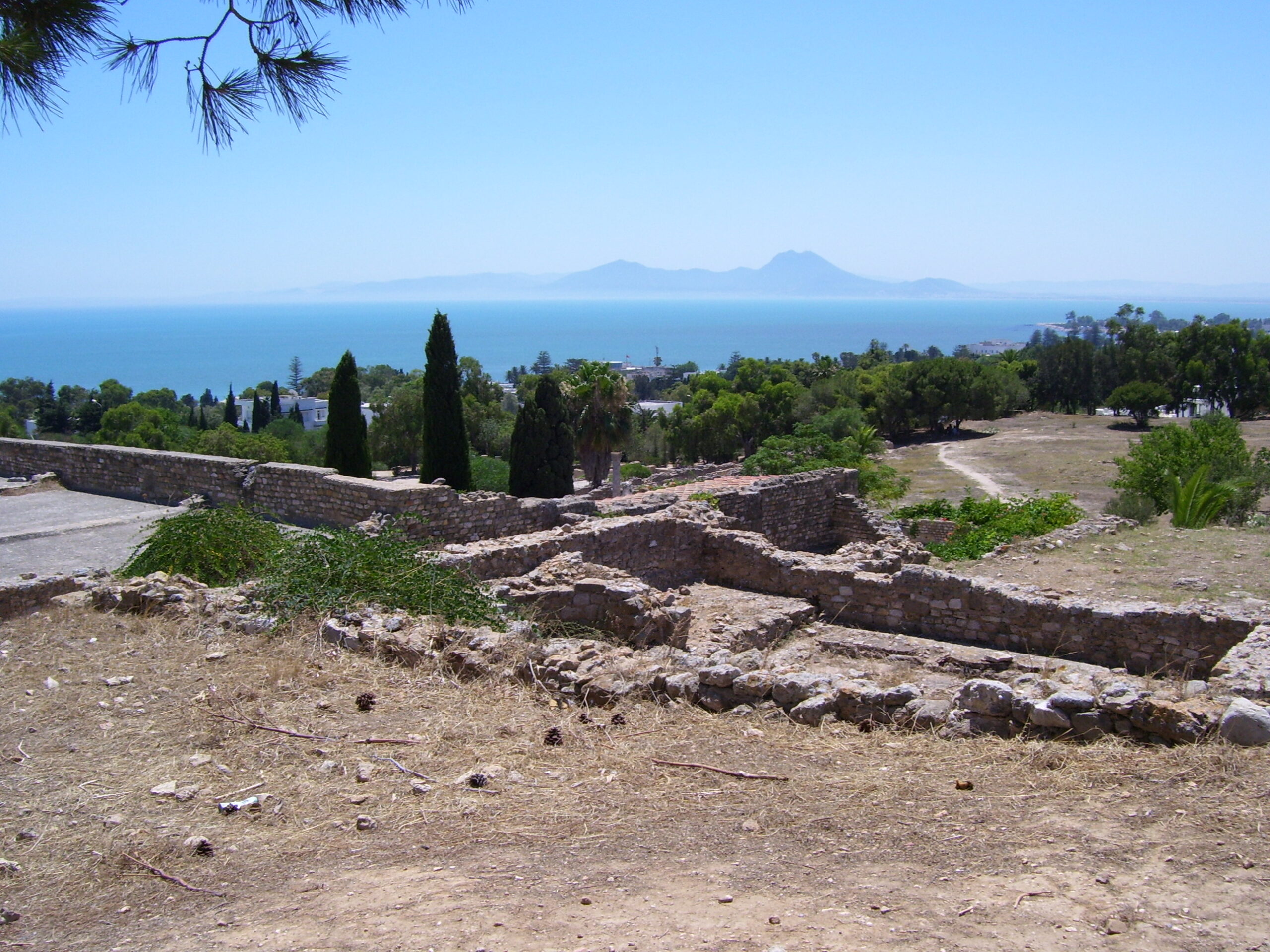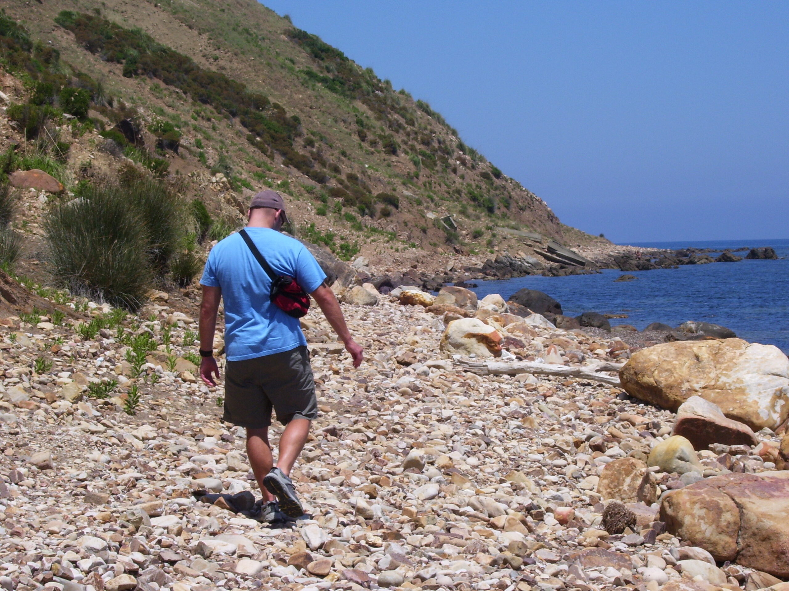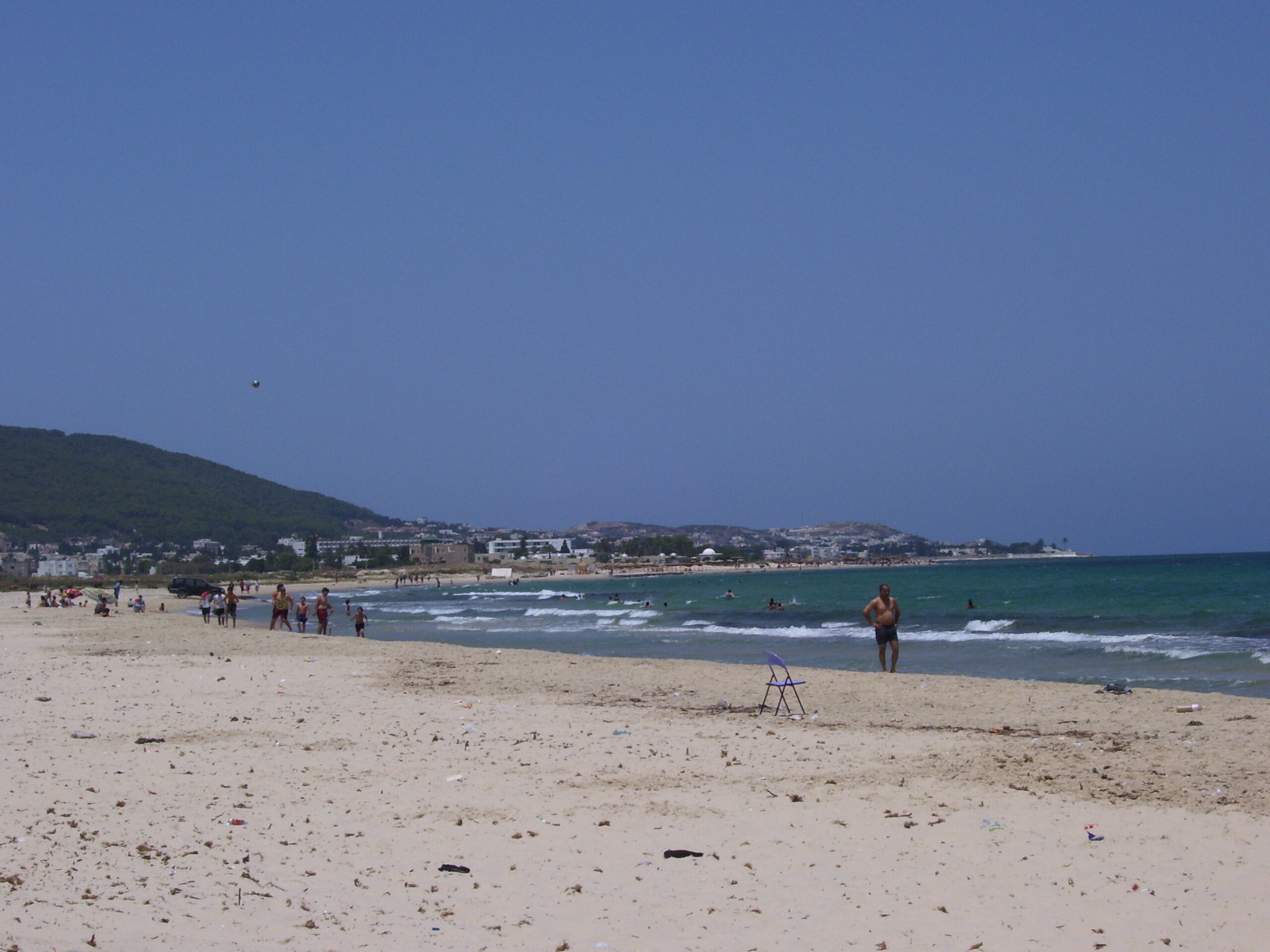 As Wednesday was our last day, we spent it at Carthage. So, this is where all the white people are. By the way, Jamie and I are freaks. We’ve been stared at, especially him, since I’m a woman they won’t look at me. But here’s all the white people and they’re giant, silly tour buses. We make it up to the museum entrance, and there are eight tour buses parked, not a good sign. And it follows suit, while we’re in the museum we must work our way around the constant space hogging group. But as some pay-back, they all wear stickers indicating what group they’re in. It’s like they’re in kindergarten! Our society really needs to grow a pair. After Carthage, we wanted to hit the beach for the last time. Jamie had read about a beach on the way back from Cathage, so we gave it a shot, and it was disgusting. Garbage, swarms of people, no room, and a grass filled swimming area. We walk to the water to look for a spot, and there isn’t one. Poor Jamie knew I wanted a swim and was trying to find us a spot. He said, “well, do you want to head down this and look?”