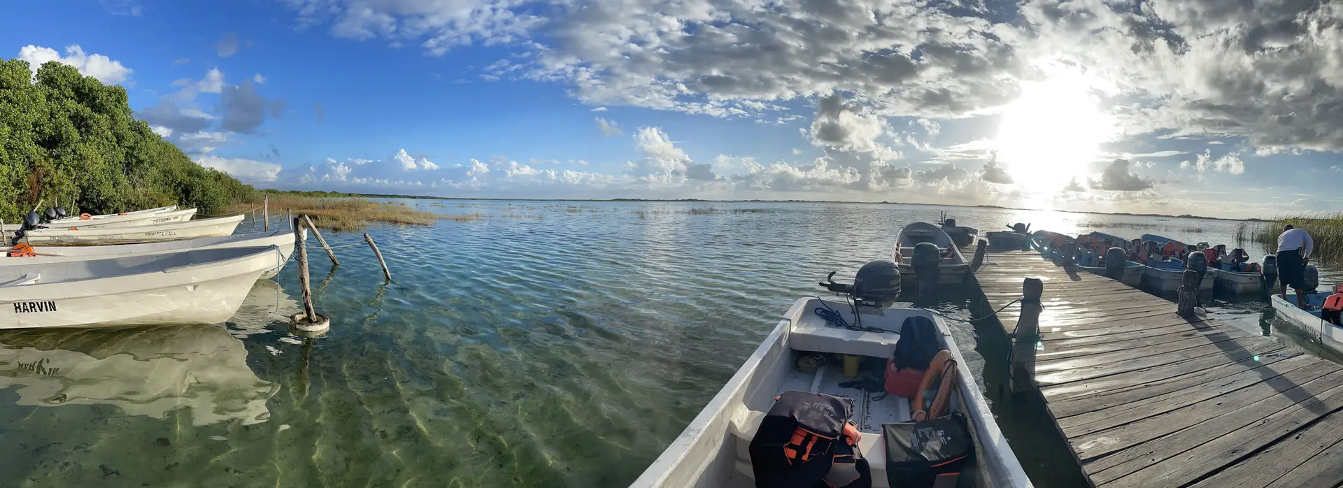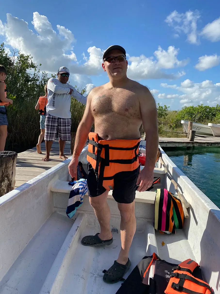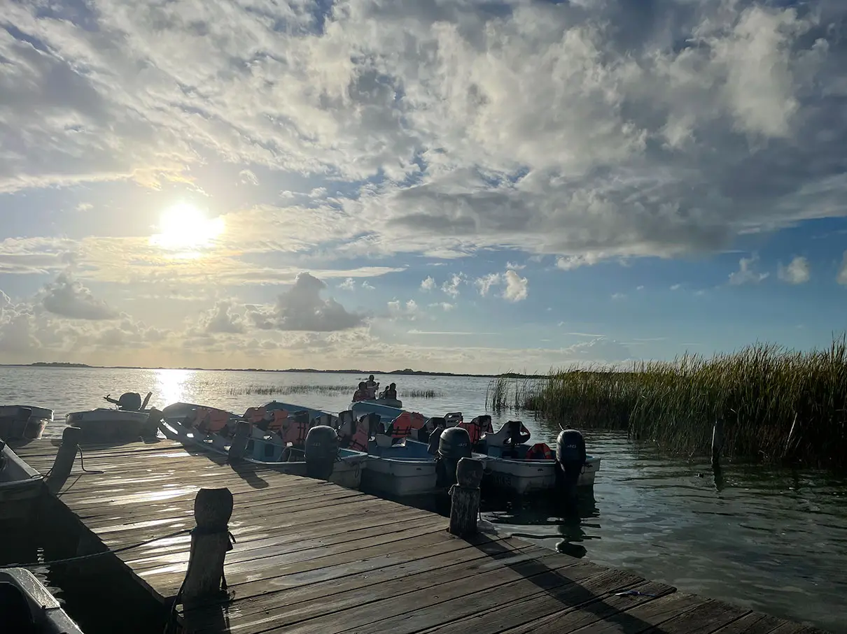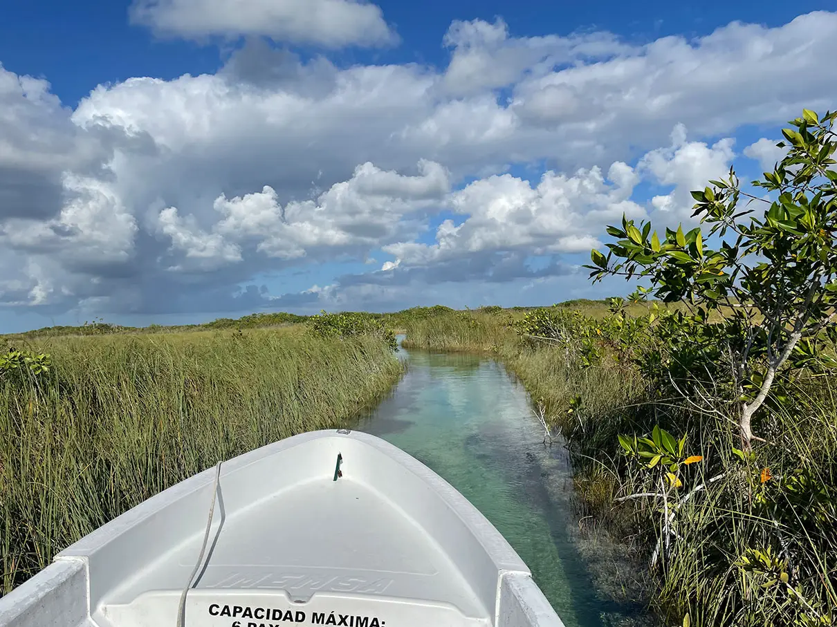What a perfect day! We got up early and made our way to Laguna Tours Muyil, hoping to book a boat trip through the Sian Ka’an Preserve. We arrived about 7:45AM, but they didn’t open until 8AM, so there was a rope blocking the driveway. After a little bit, a guy with an official-looking shirt came over, said Buenos Dias, and asked what we were looking for. We told him the Laguan Tours and luckily, he pulled out a brochure to show us what the tour entailed. he told us it was a 2-hour tour and cost $1,000 pesos per person. We agreed, paid him, and he told us to follow him on his bike to the parking lot. We did – which was a little sketchy as he was riding his bike on the side of the highway while we were following slowly behind him. Luckily traffic cleared enough for him cross it in time! We parked then wandered to the dock at the lagoon. Beautiful!