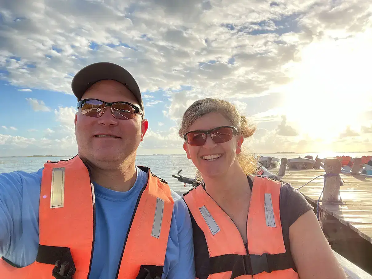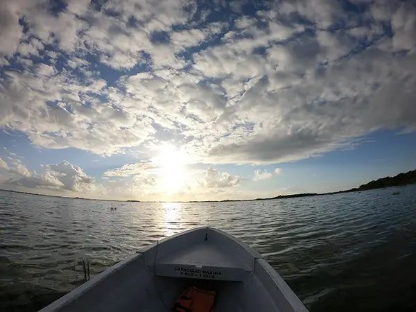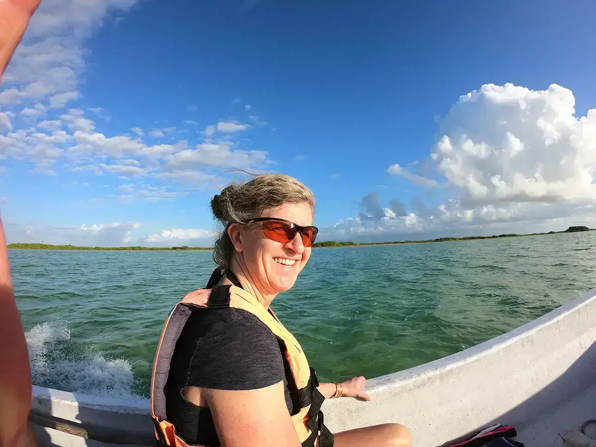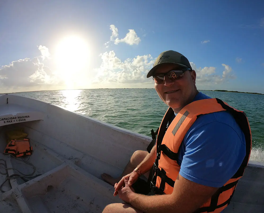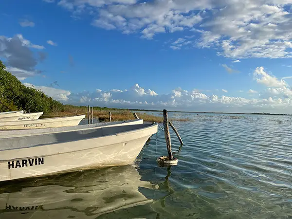 What a perfect day! We got up early and made our way to Laguna Tours Muyil, hoping to book a boat trip through the Sian Ka’an Preserve. We arrived about 7:45AM, but they didn’t open until 8AM, so there was a rope blocking the driveway. After a little bit, a guy with an official-looking shirt came over, said Buenos Dias, and asked what we were looking for. We told him the Laguan Tours and luckily, he pulled out a brochure to show us what the tour entailed. he told us it was a 2-hour tour and cost $1,000 pesos per person. We agreed, paid him, and he told us to follow him on his bike to the parking lot. We did – which was a little sketchy as he was riding his bike on the side of the highway while we were following slowly behind him. Luckily traffic cleared enough for him cross it in time! We parked then wandered to the dock at the lagoon. Beautiful!